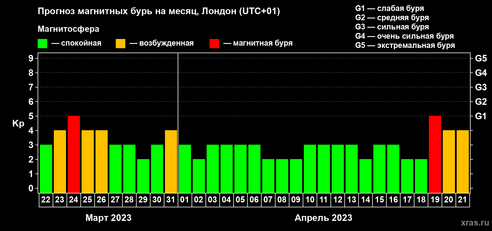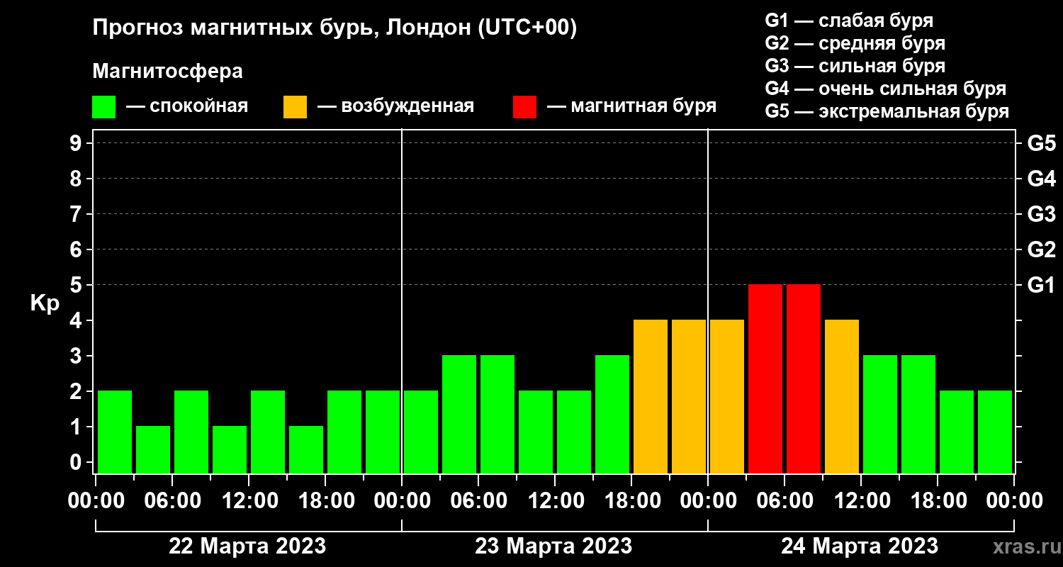 Прогноз магнитных бурь в Лондоне на 22 марта 2023 года