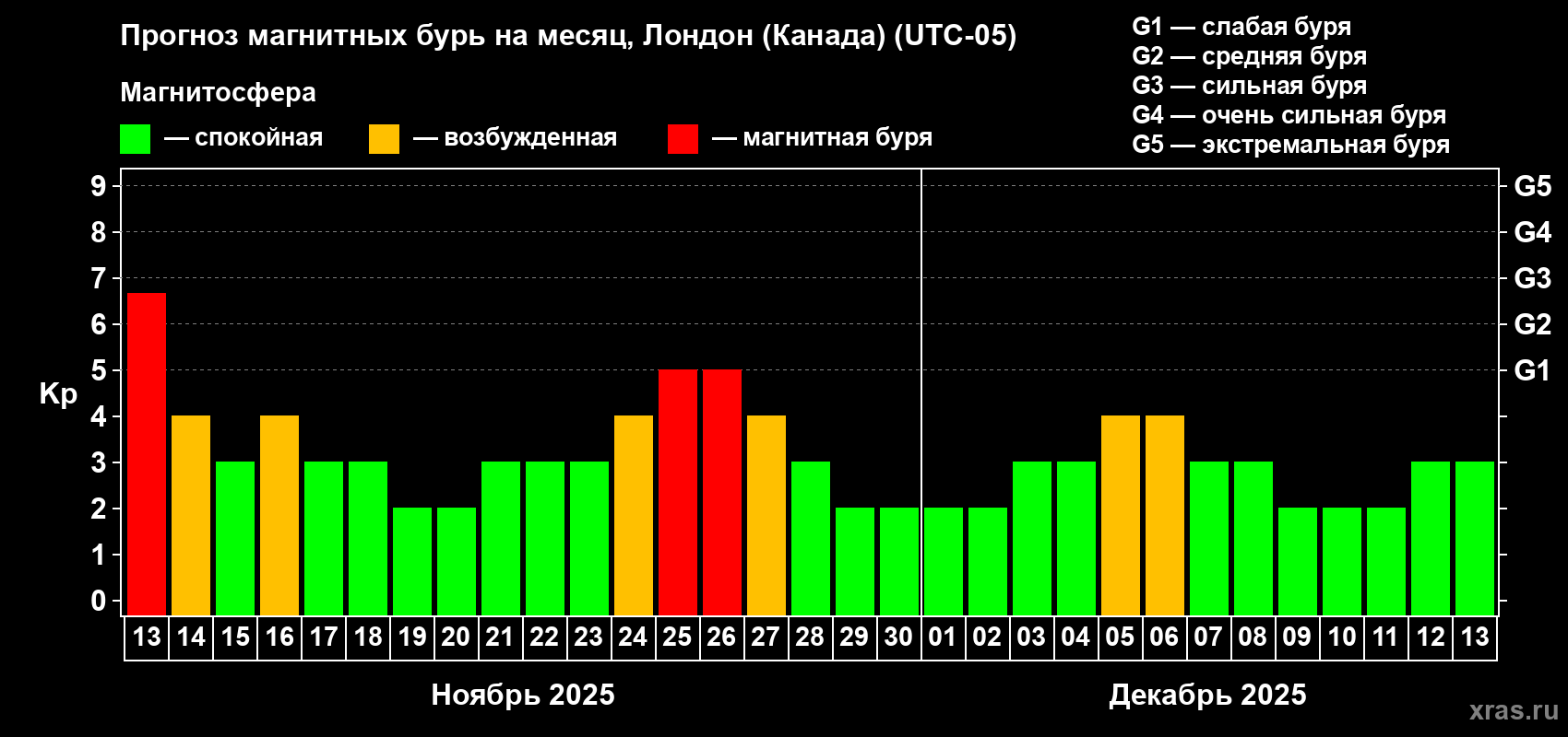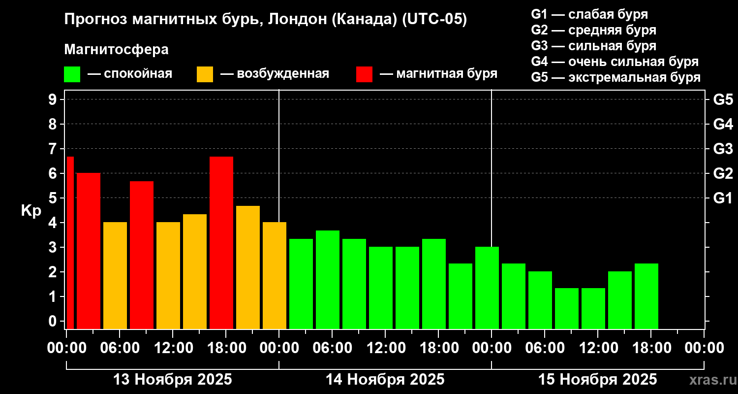 Прогноз магнитных бурь Лондоне (Канада) — 13 ноября 2025 года
