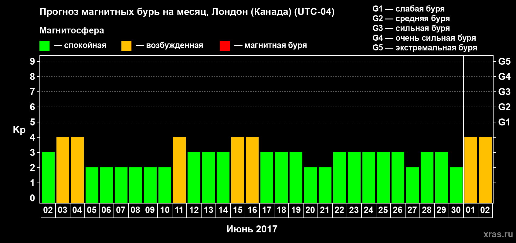 Прогноз магнитных бурь Лондоне (Канада) — 2 июня 2017 года