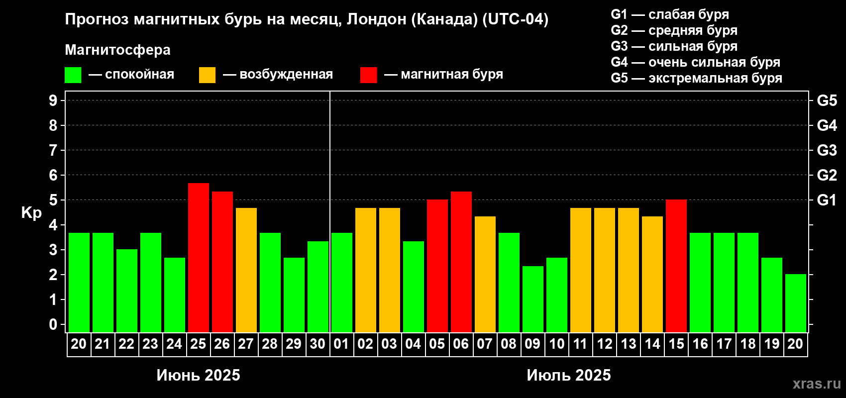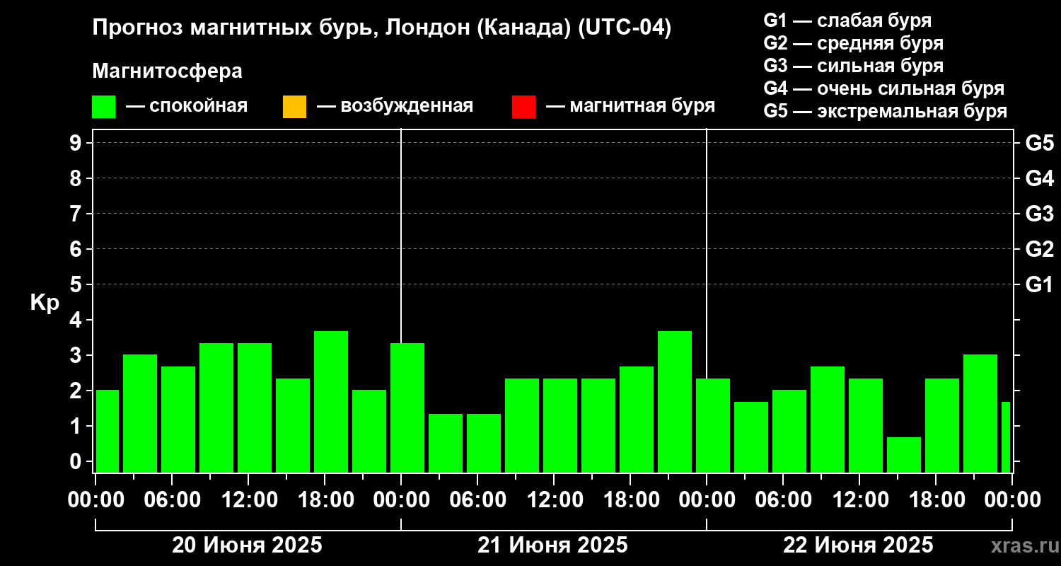 Прогноз магнитных бурь Лондоне (Канада) — 20 июня 2025 года