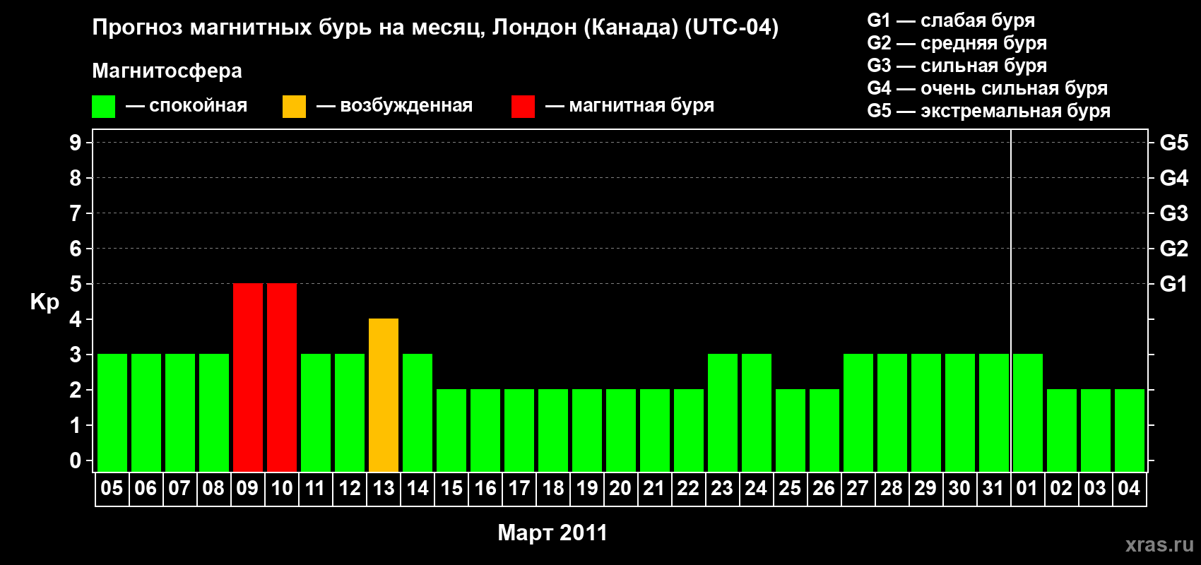 Прогноз магнитных бурь Лондоне (Канада) на 5 марта 2011 года