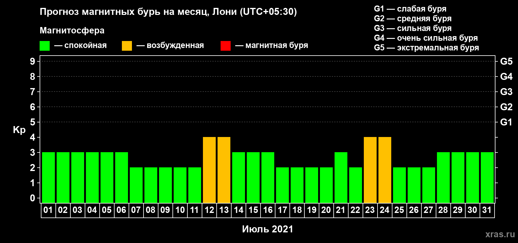 Прогноз максимального суточного геомагнитного индекса Kp на <b>1 месяц</b> (31 день) <b>с 01 июля по 31 июля 2021 г</b>