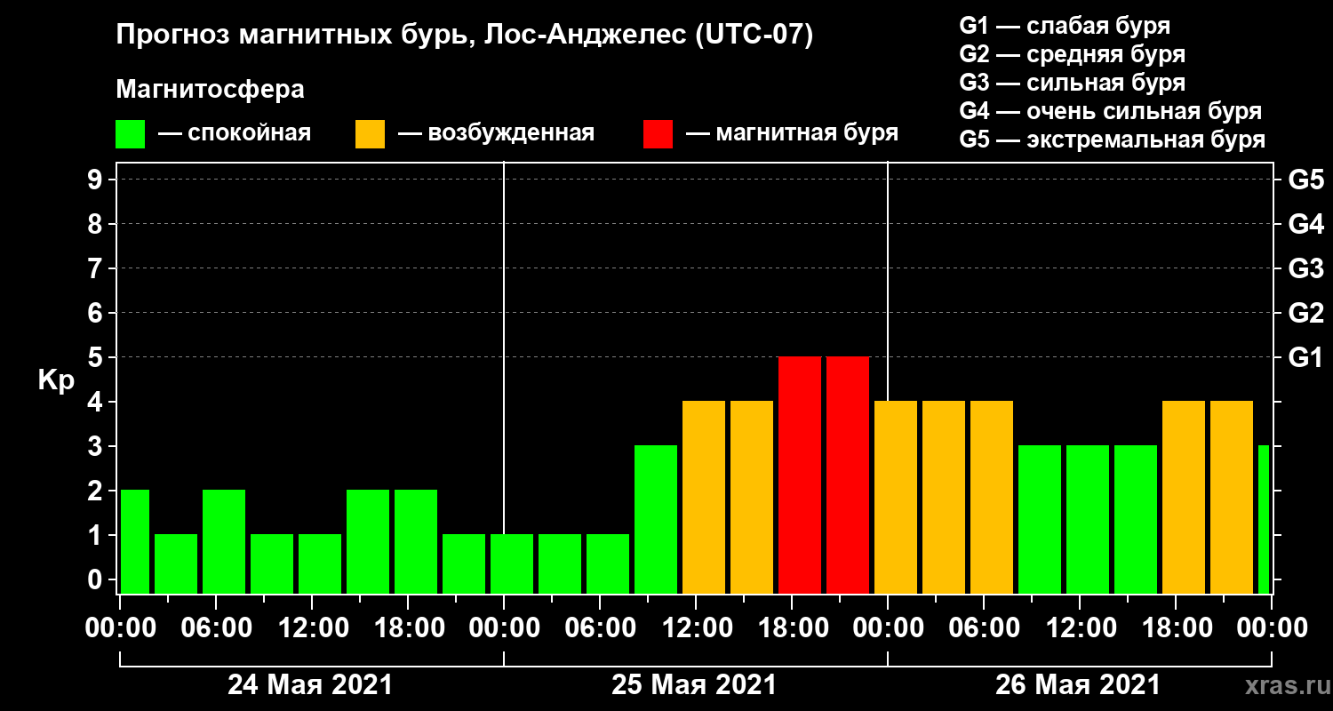 Прогноз магнитных бурь в Лос-Анджелесе на 24 мая 2021 года