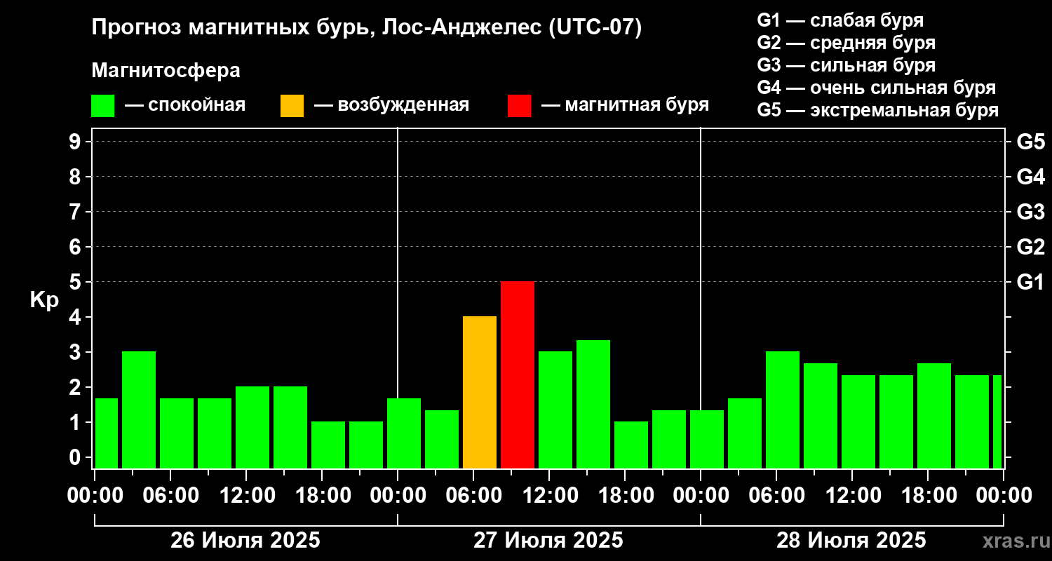 Прогноз магнитных бурь в Лос-Анджелесе на 26 июля 2025 года