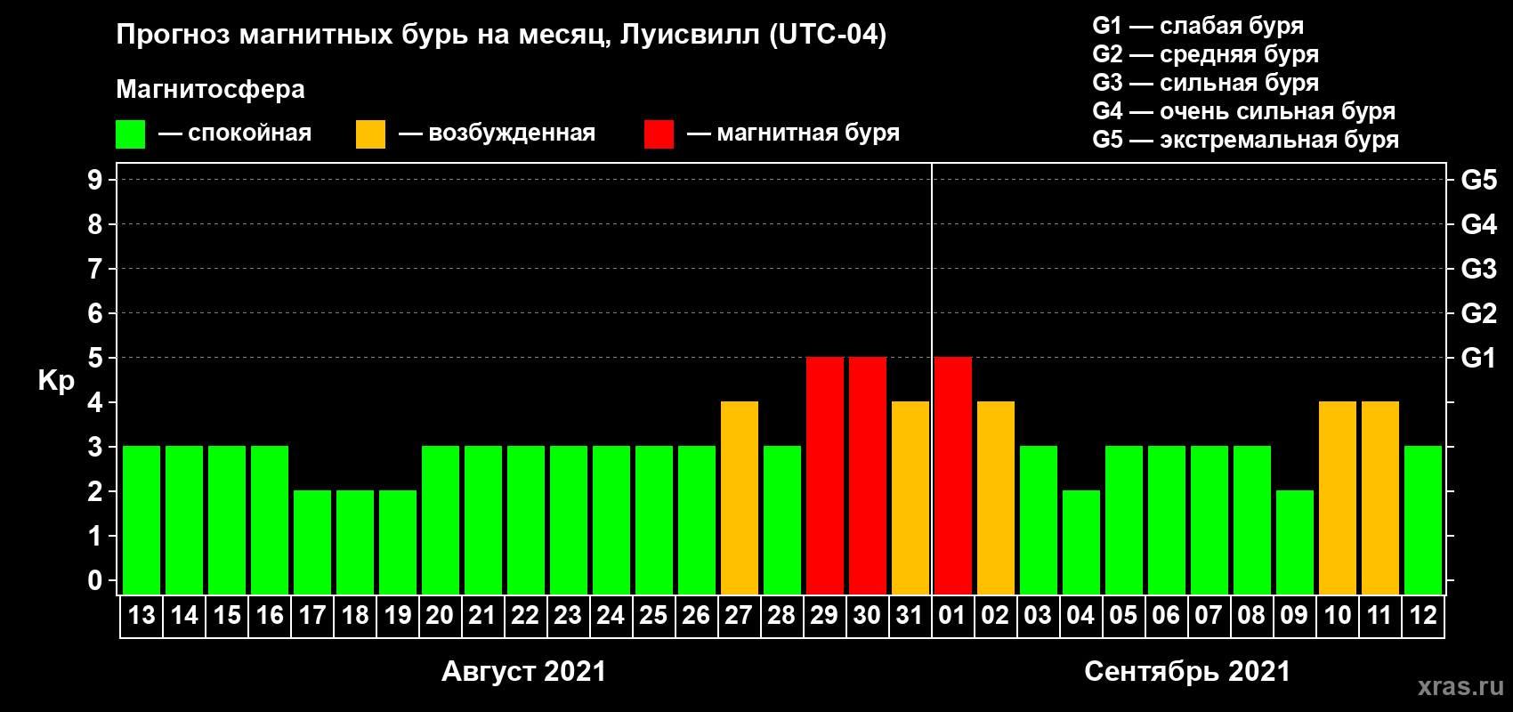 Прогноз магнитных бурь в Луисвилле на 13 августа 2021 года