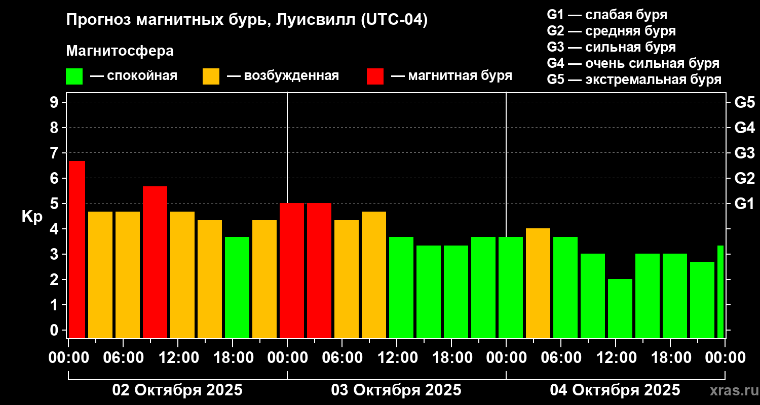 Прогноз магнитных бурь в Луисвилле на 2 октября 2025 года