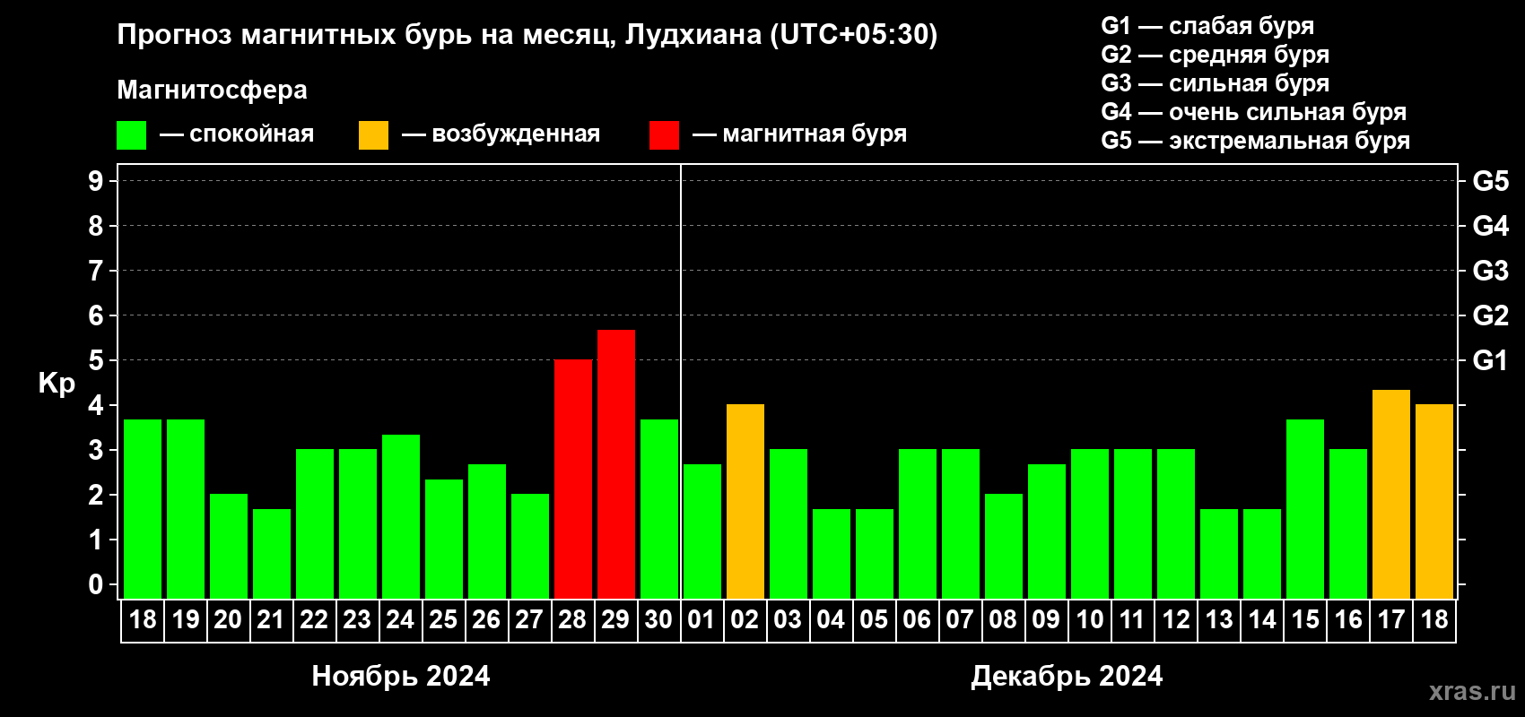 Прогноз магнитных бурь в Лудхиане — 18 ноября 2024 года