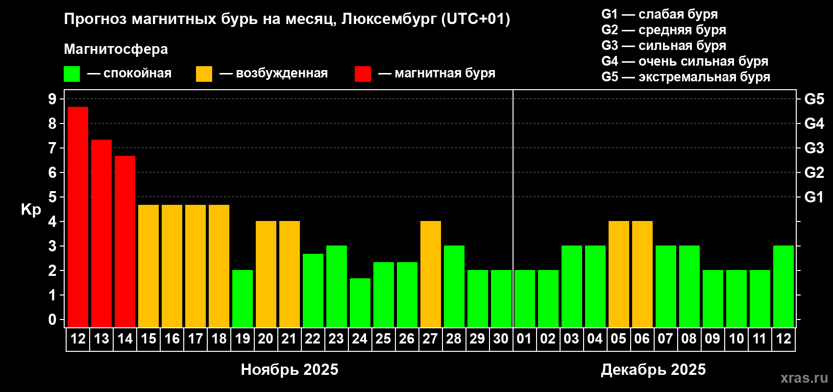 Прогноз магнитных бурь в Люксембурге — 12 ноября 2025 года