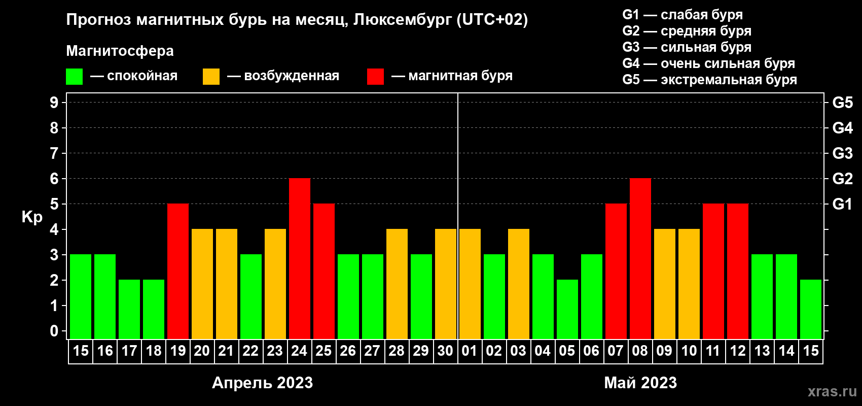 Прогноз магнитных бурь в Люксембурге — 15 апреля 2023 года