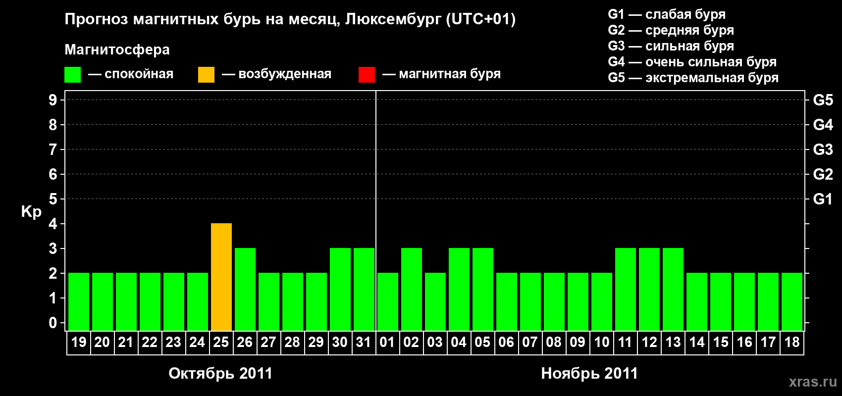 Прогноз магнитных бурь в Люксембурге — 19 октября 2011 года