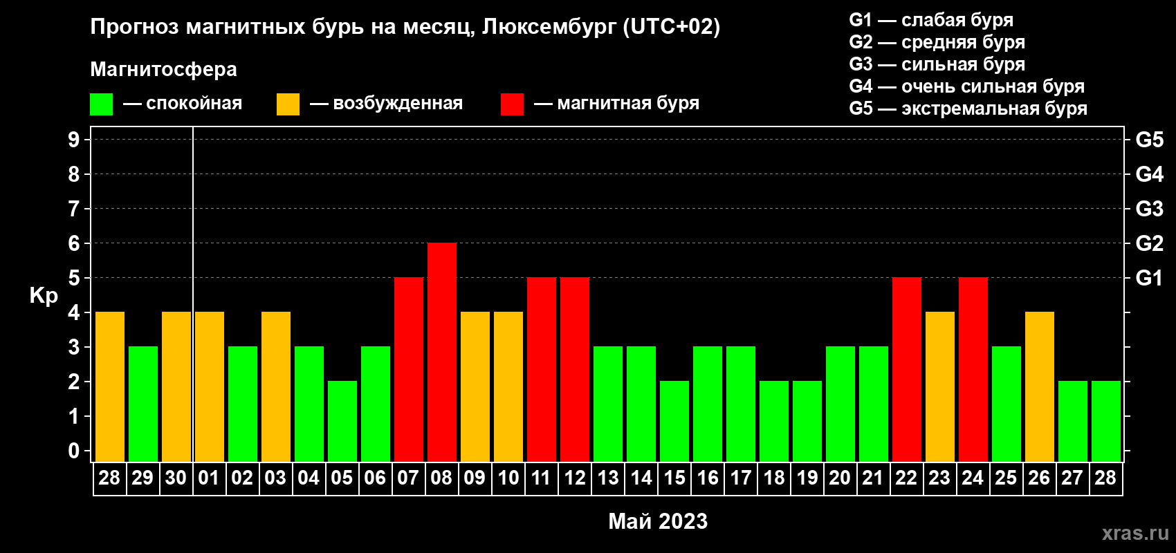 Прогноз магнитных бурь в Люксембурге — 28 апреля 2023 года