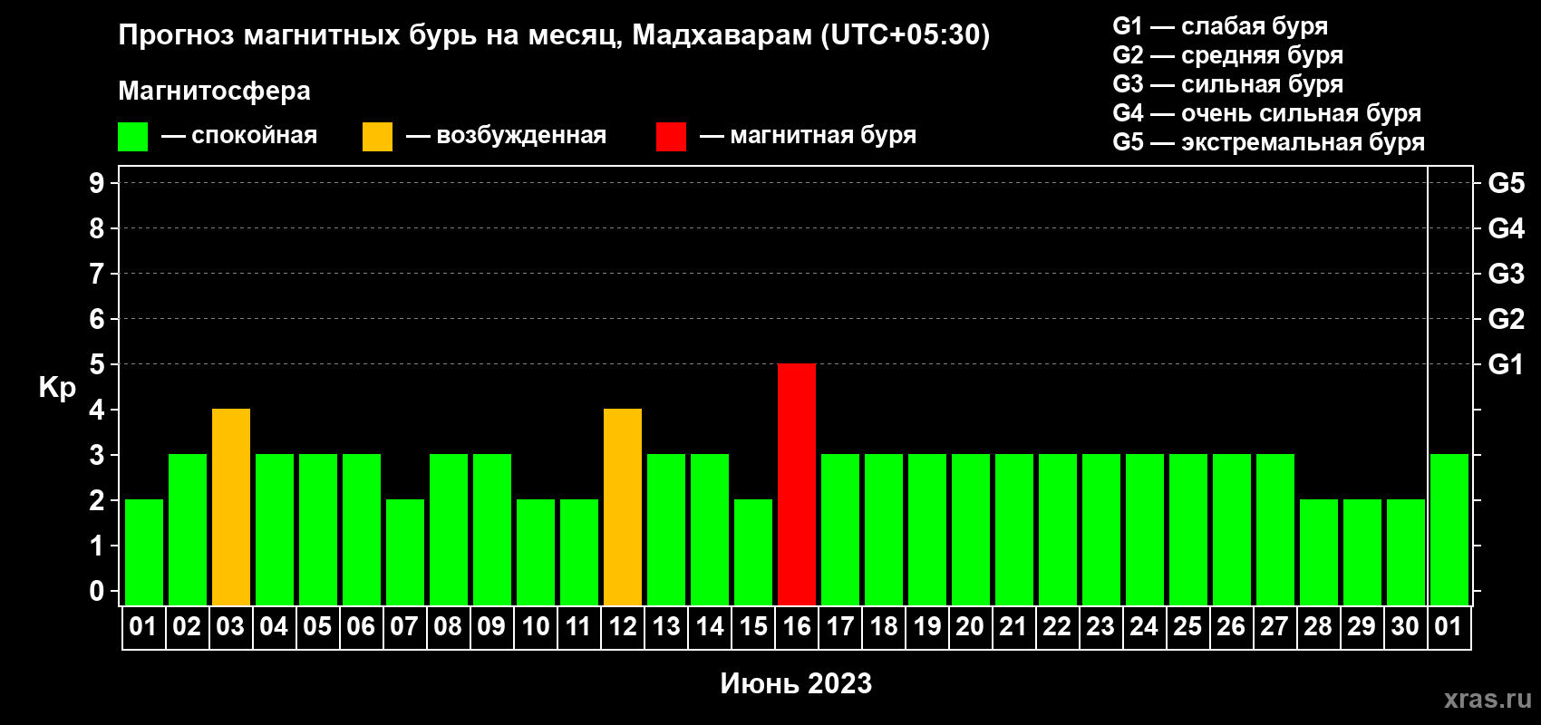 Прогноз магнитных бурь в Мадхавараме — 1 июня 2023 года