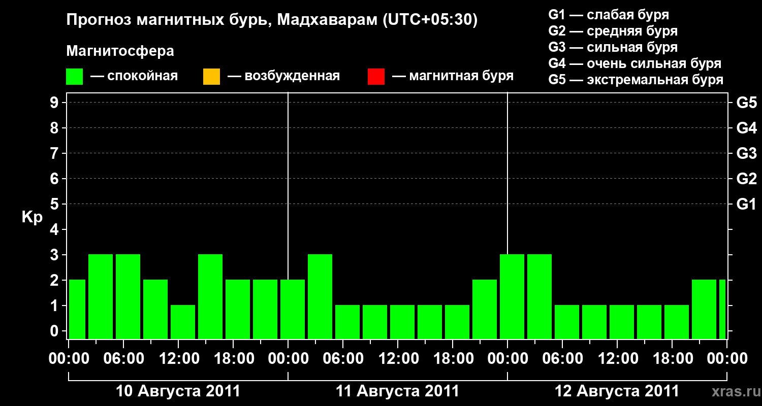 Прогноз магнитных бурь в Мадхавараме — 10 августа 2011 года