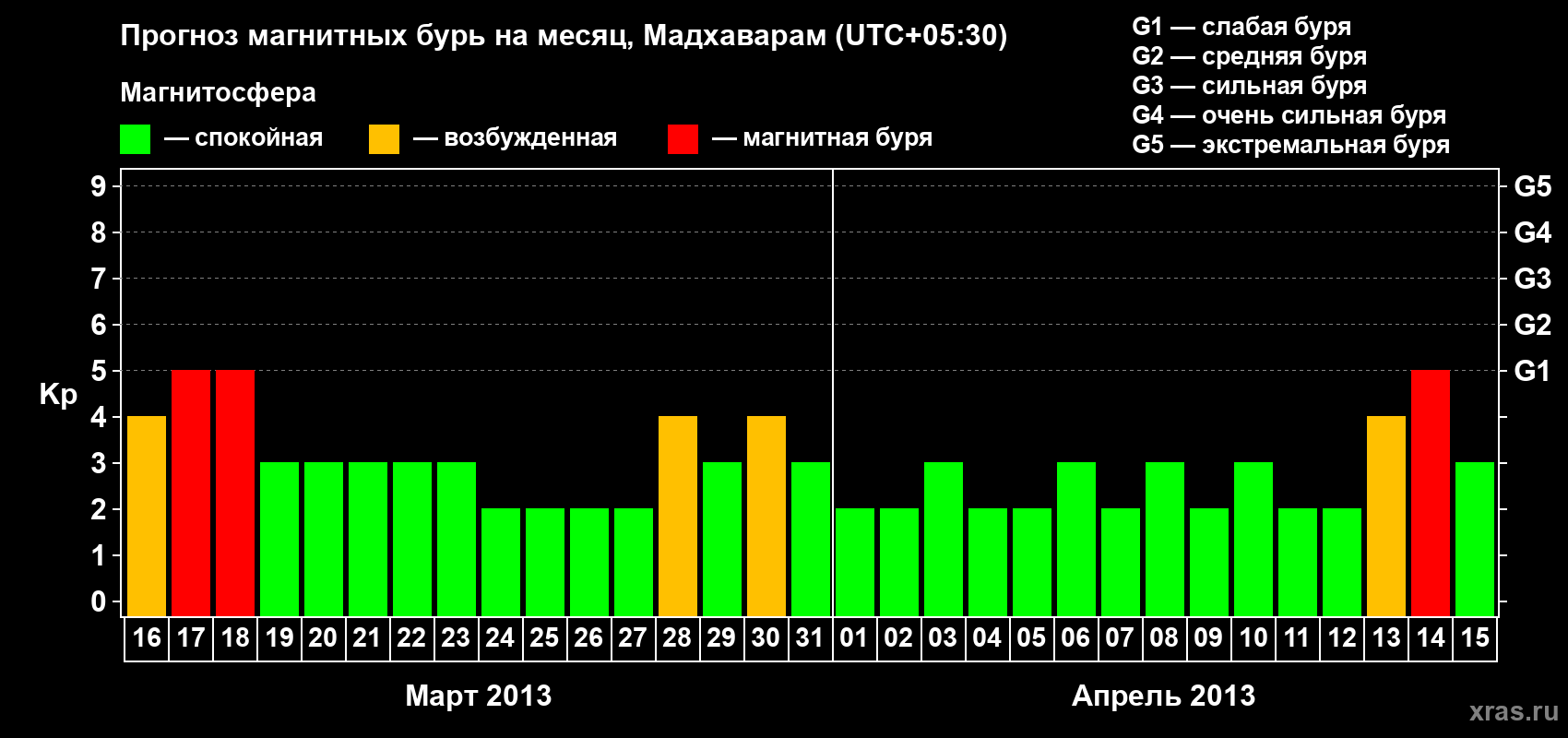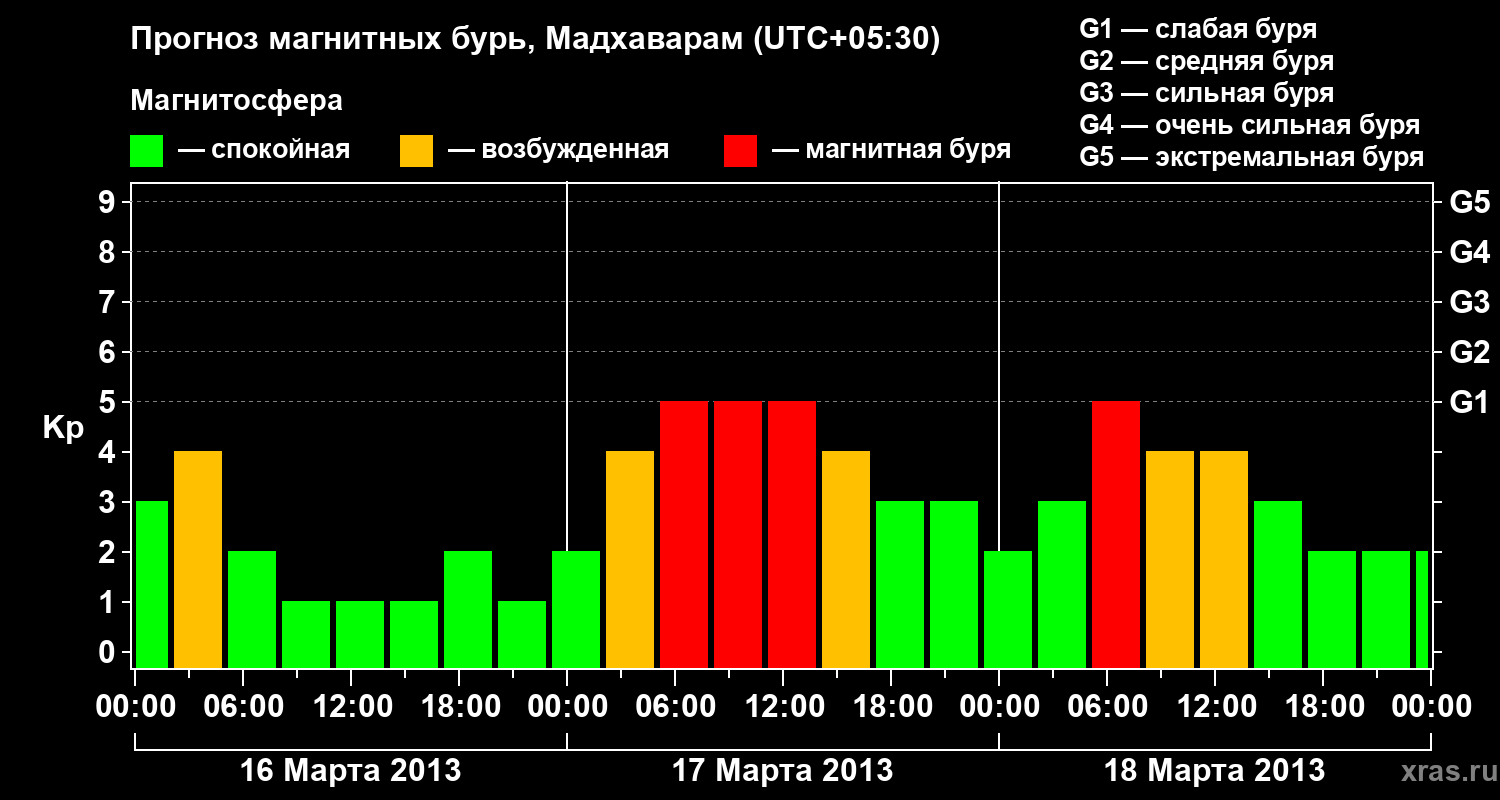 Прогноз магнитных бурь в Мадхавараме — 16 марта 2013 года