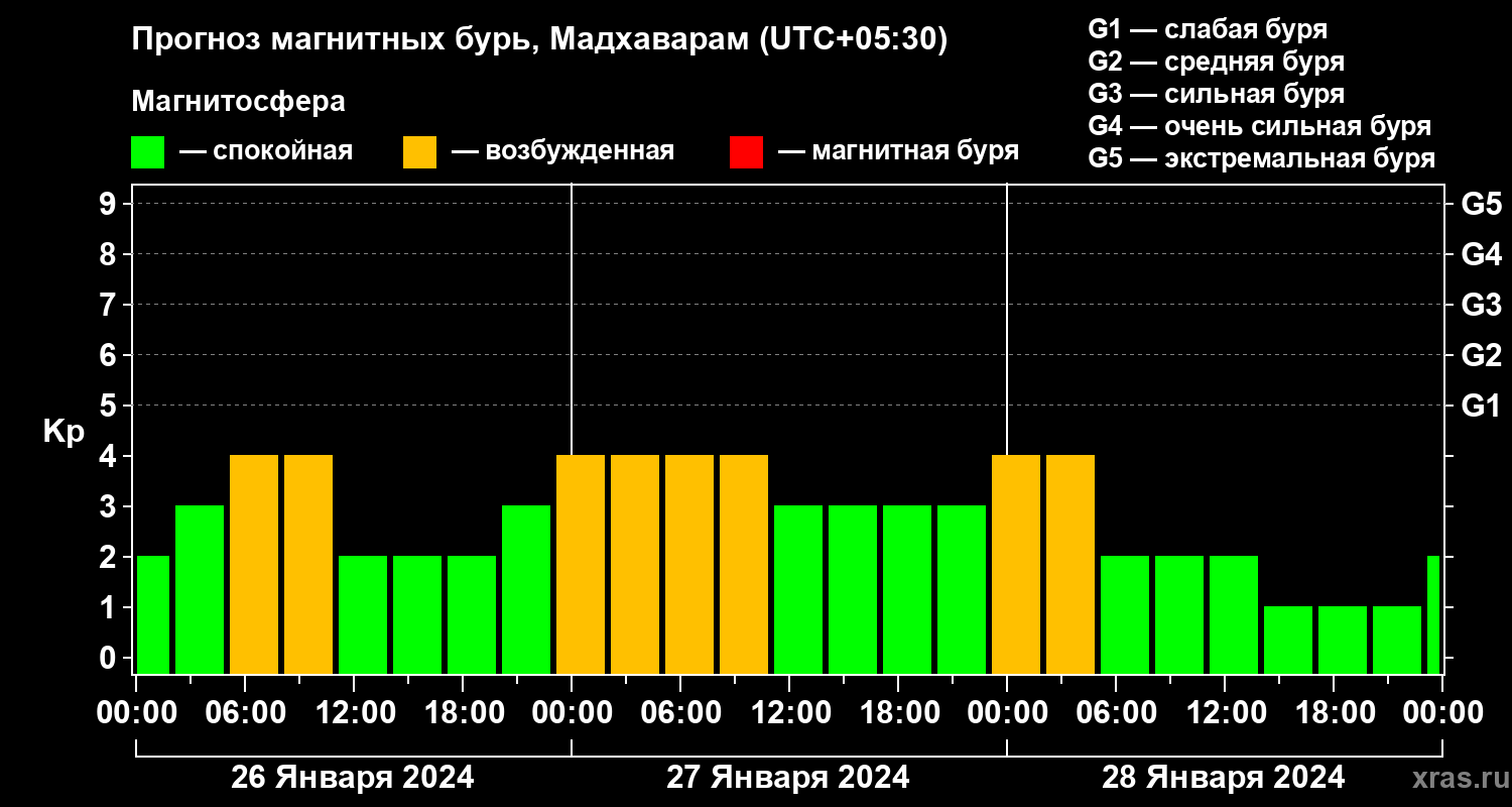 Прогноз магнитных бурь в Мадхавараме — 26 января 2024 года