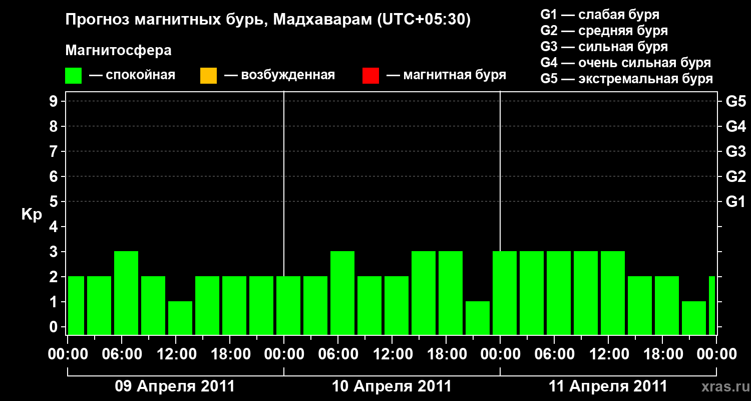 Прогноз магнитных бурь в Мадхавараме — 9 апреля 2011 года