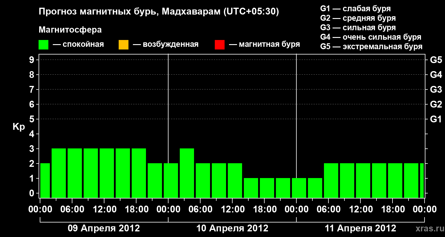 Прогноз магнитных бурь в Мадхавараме на 9 апреля 2012 года