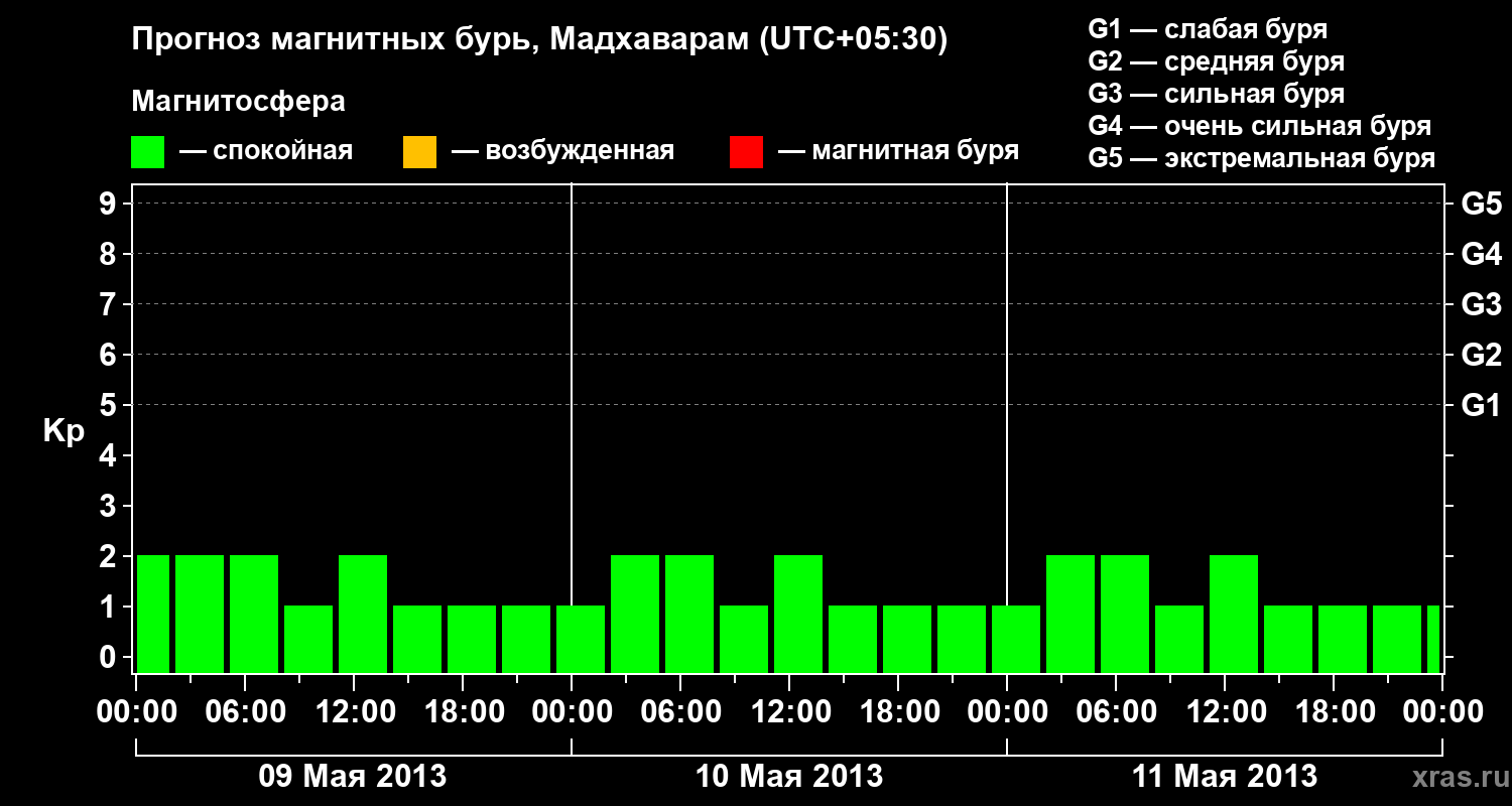 Прогноз магнитных бурь в Мадхавараме — 9 мая 2013 года