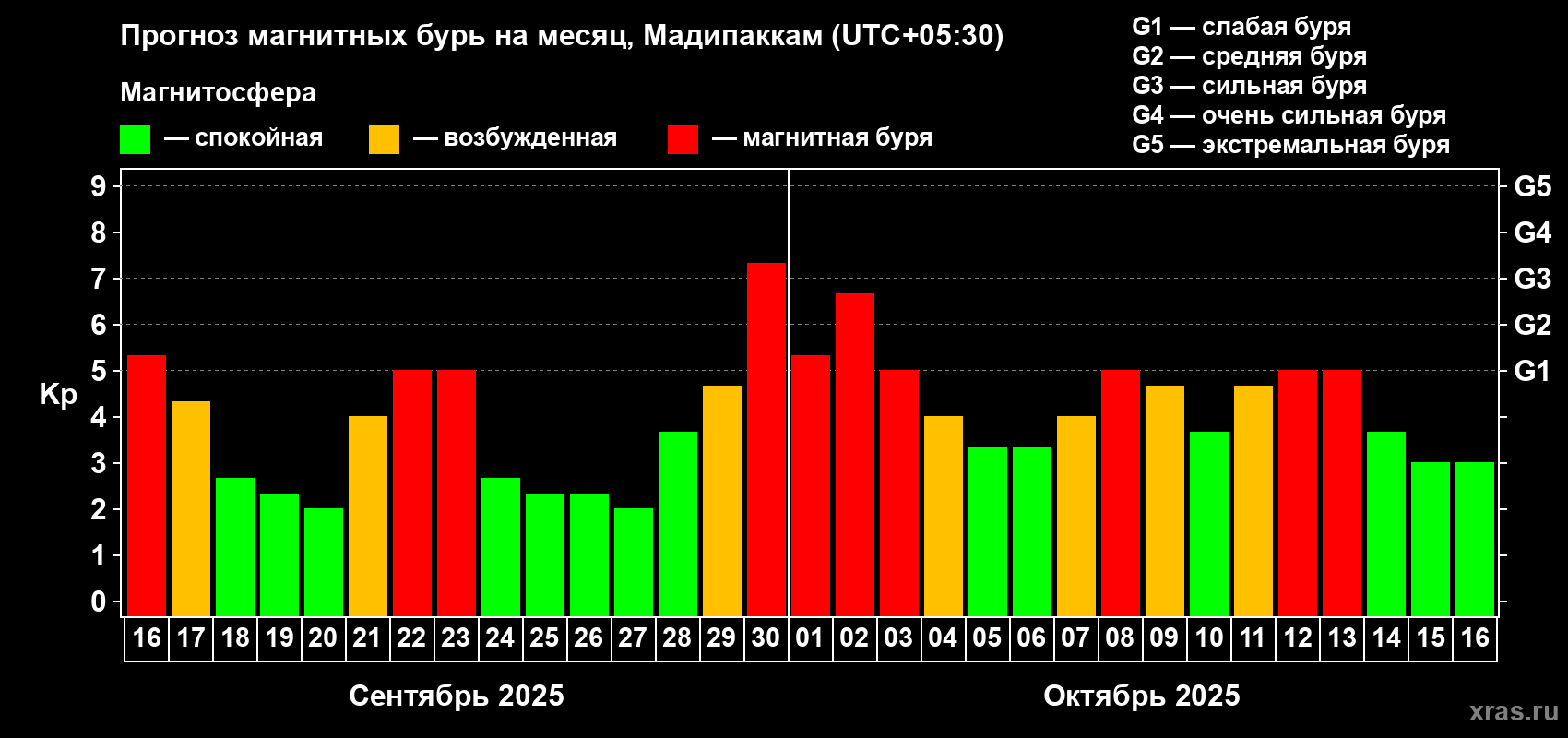 Прогноз магнитных бурь в Мадипаккаме — 16 сентября 2025 года