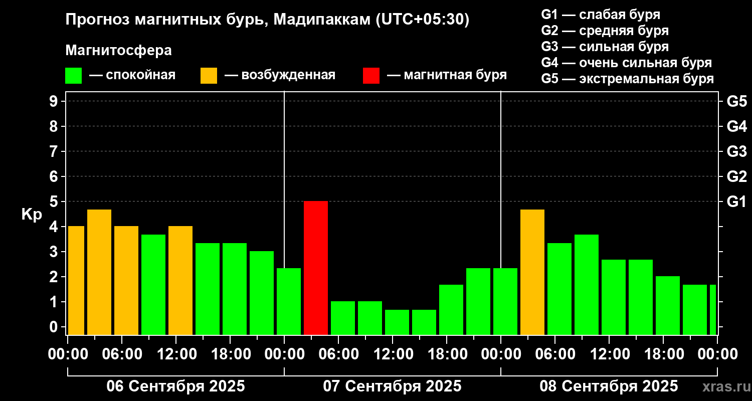 Прогноз магнитных бурь в Мадипаккаме — 6 сентября 2025 года