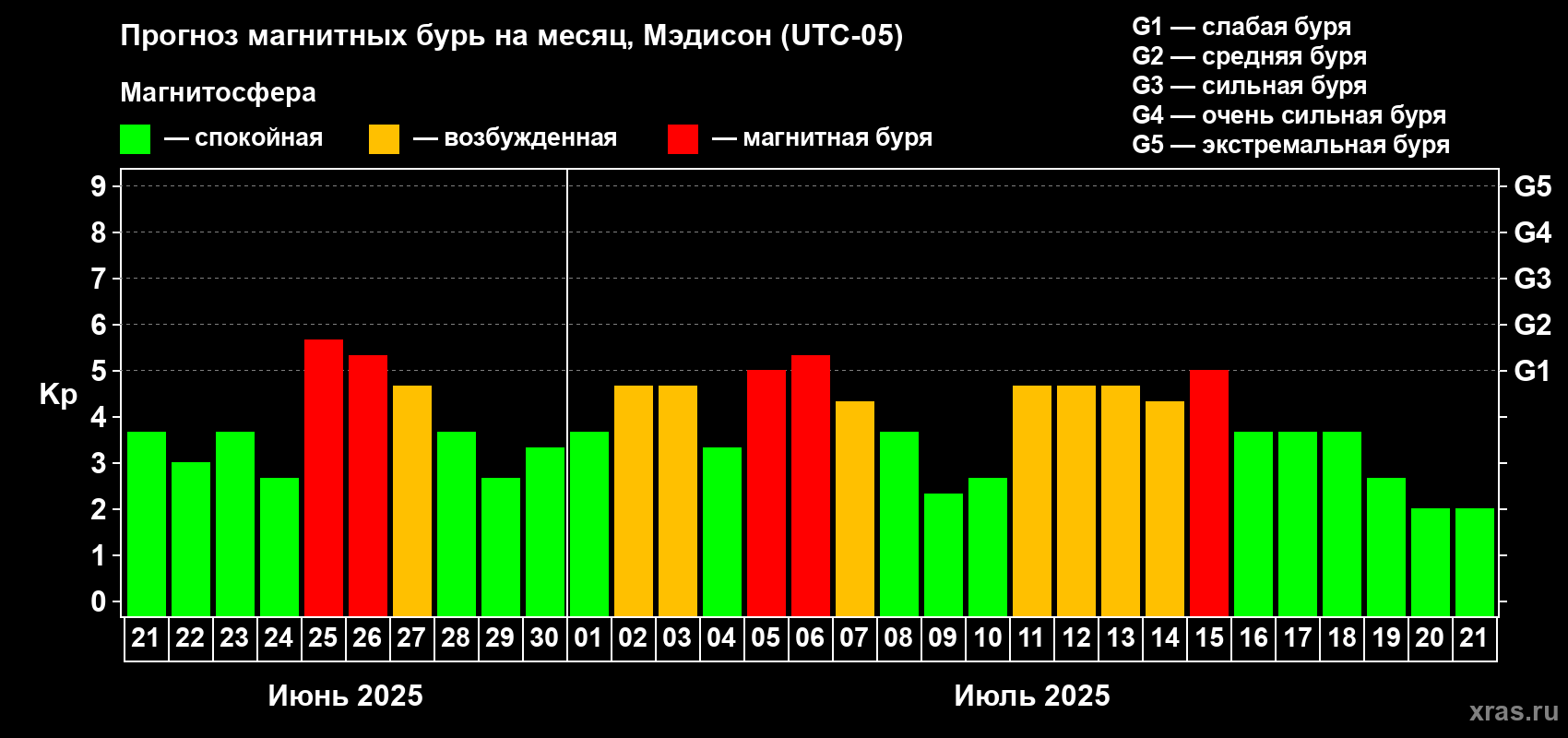 Прогноз магнитных бурь в Мэдисоне на 21 июня 2025 года