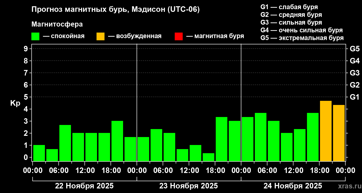 Прогноз магнитных бурь в Мэдисоне на 22 ноября 2025 года