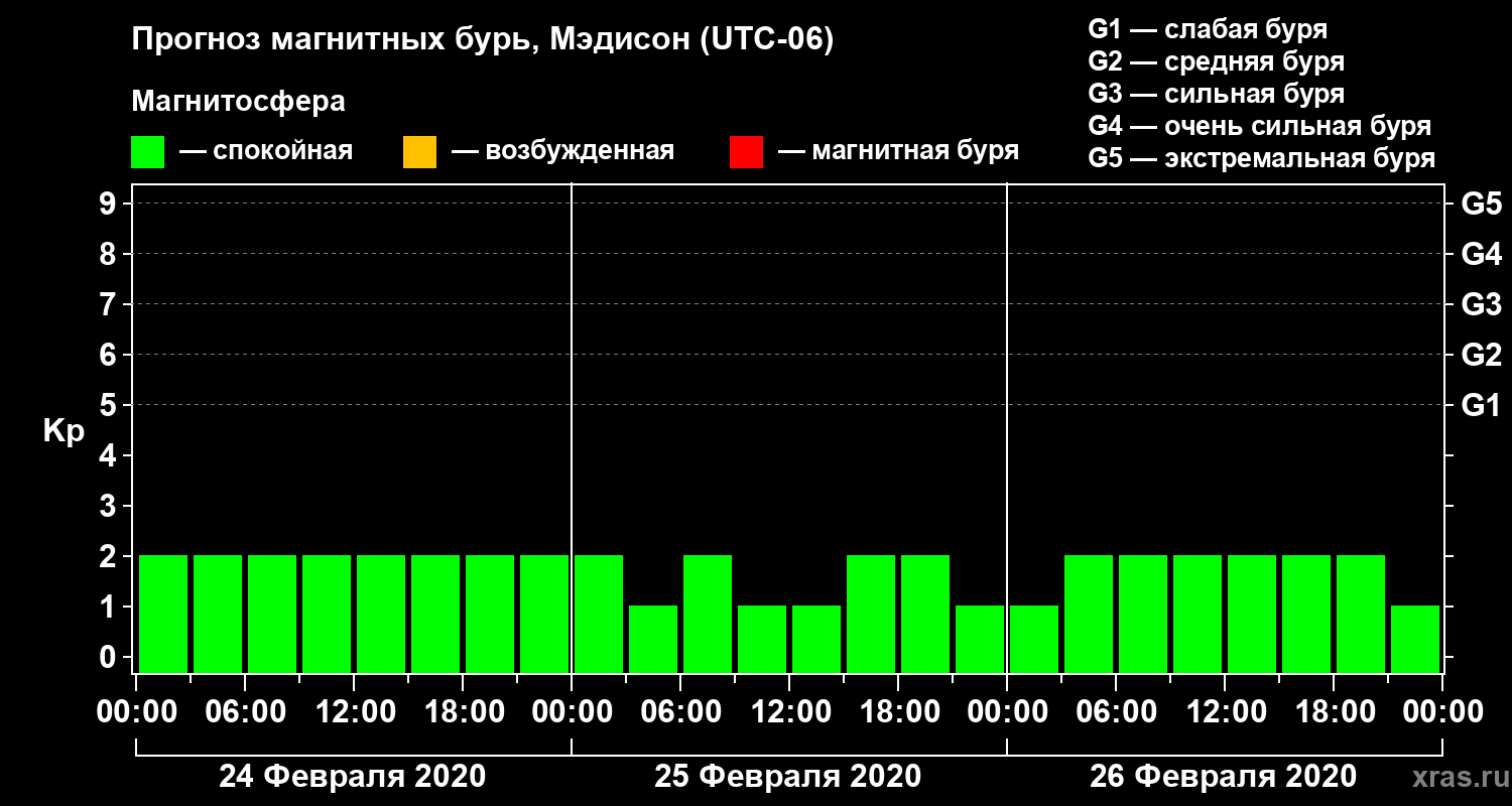 Прогноз магнитных бурь в Мэдисоне на 24 февраля 2020 года
