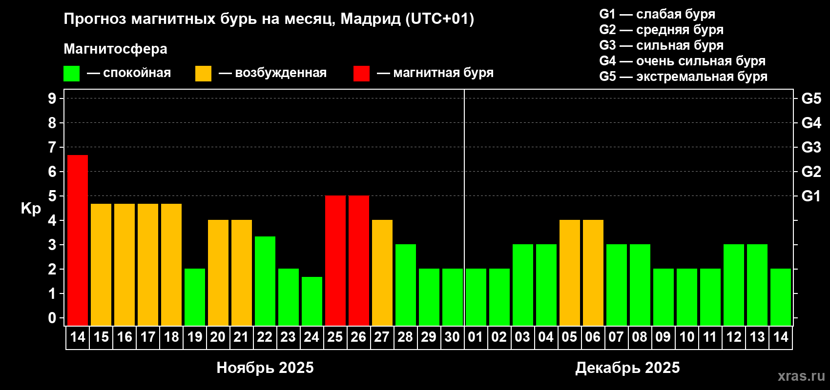 Прогноз магнитных бурь в Мадриде на 14 ноября 2025 года