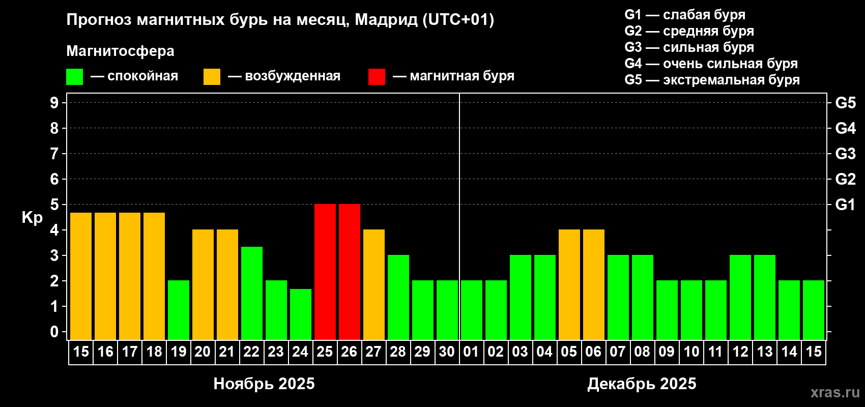 Прогноз магнитных бурь в Мадриде — 15 ноября 2025 года