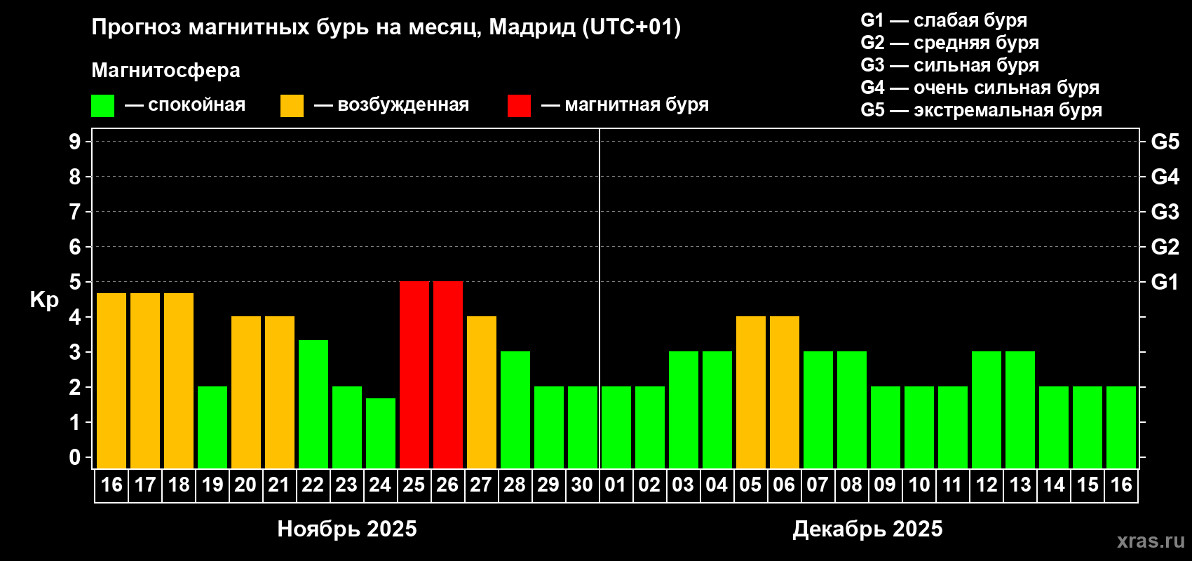 Прогноз магнитных бурь в Мадриде — 16 ноября 2025 года