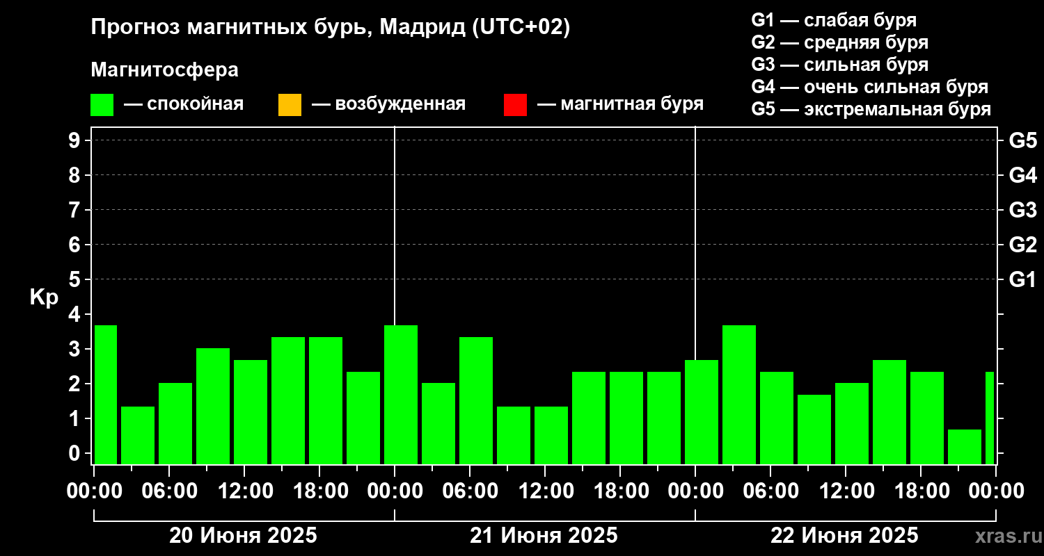 Прогноз магнитных бурь в Мадриде на 20 июня 2025 года