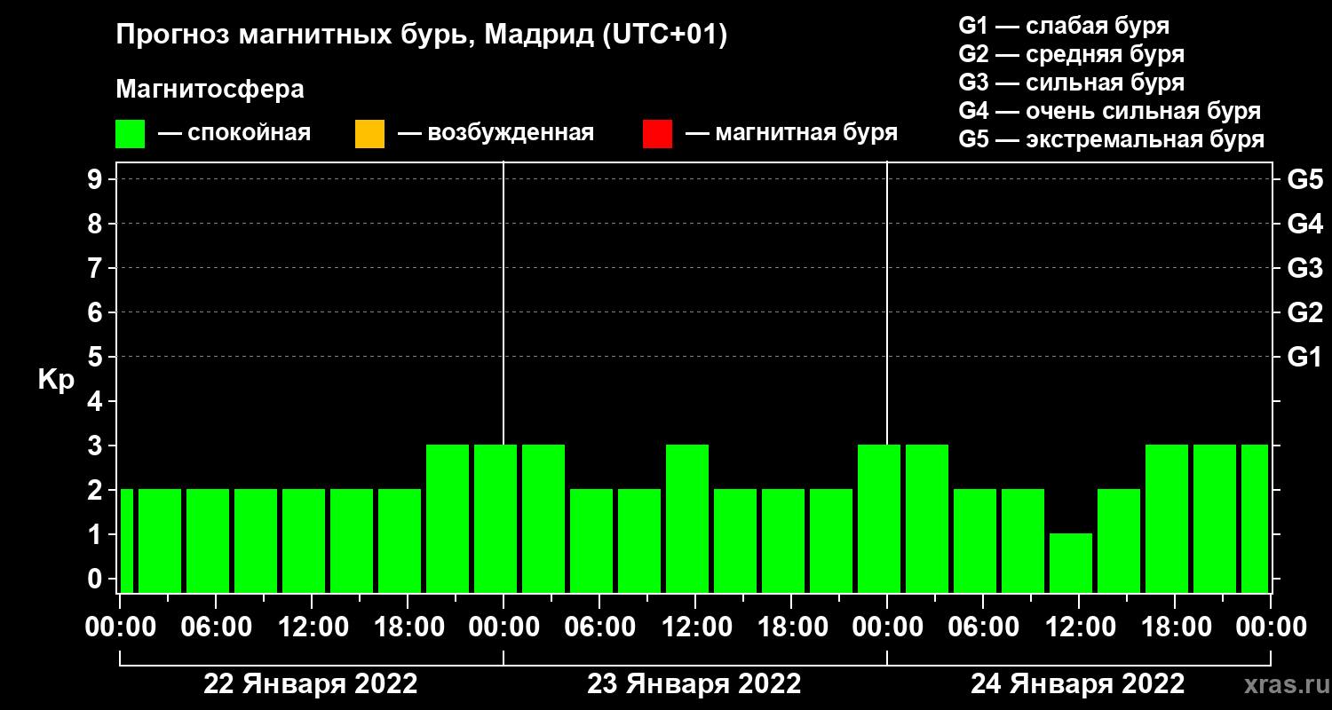 Прогноз магнитных бурь в Мадриде — 22 января 2022 года