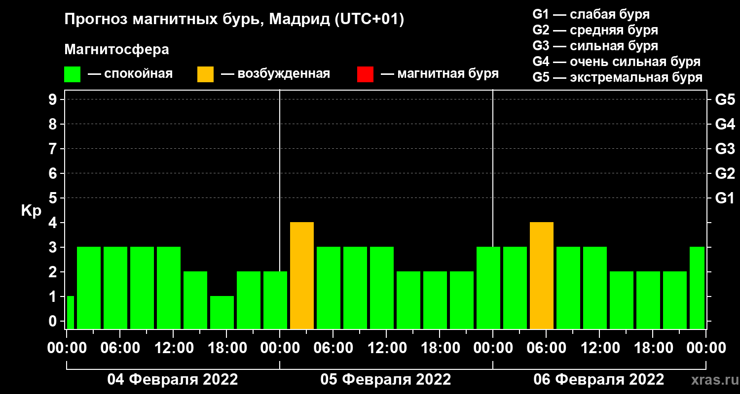 Прогноз магнитных бурь в Мадриде — 4 февраля 2022 года