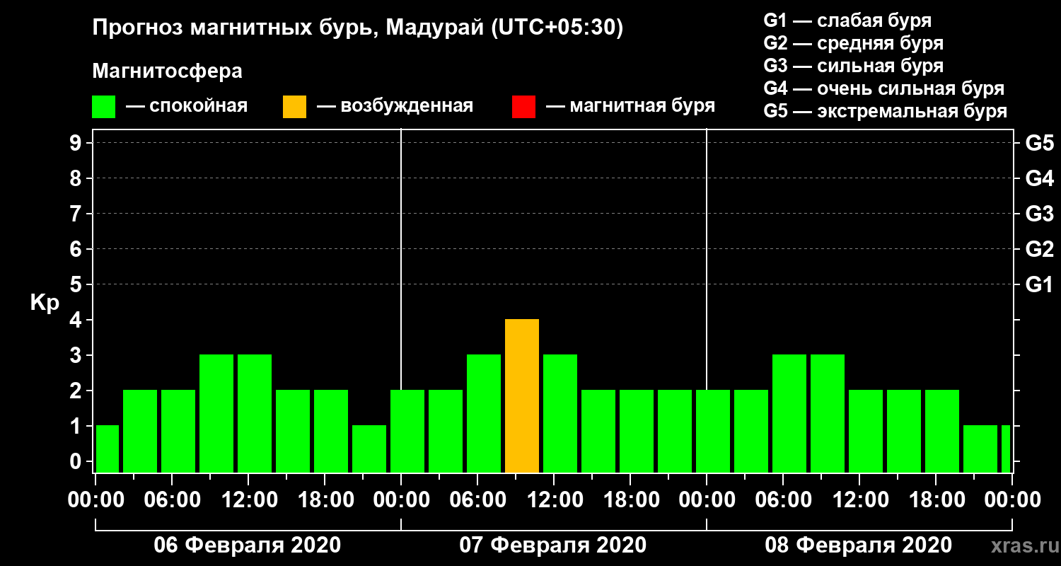 Прогноз магнитных бурь в Мадурайе — 6 февраля 2020 года