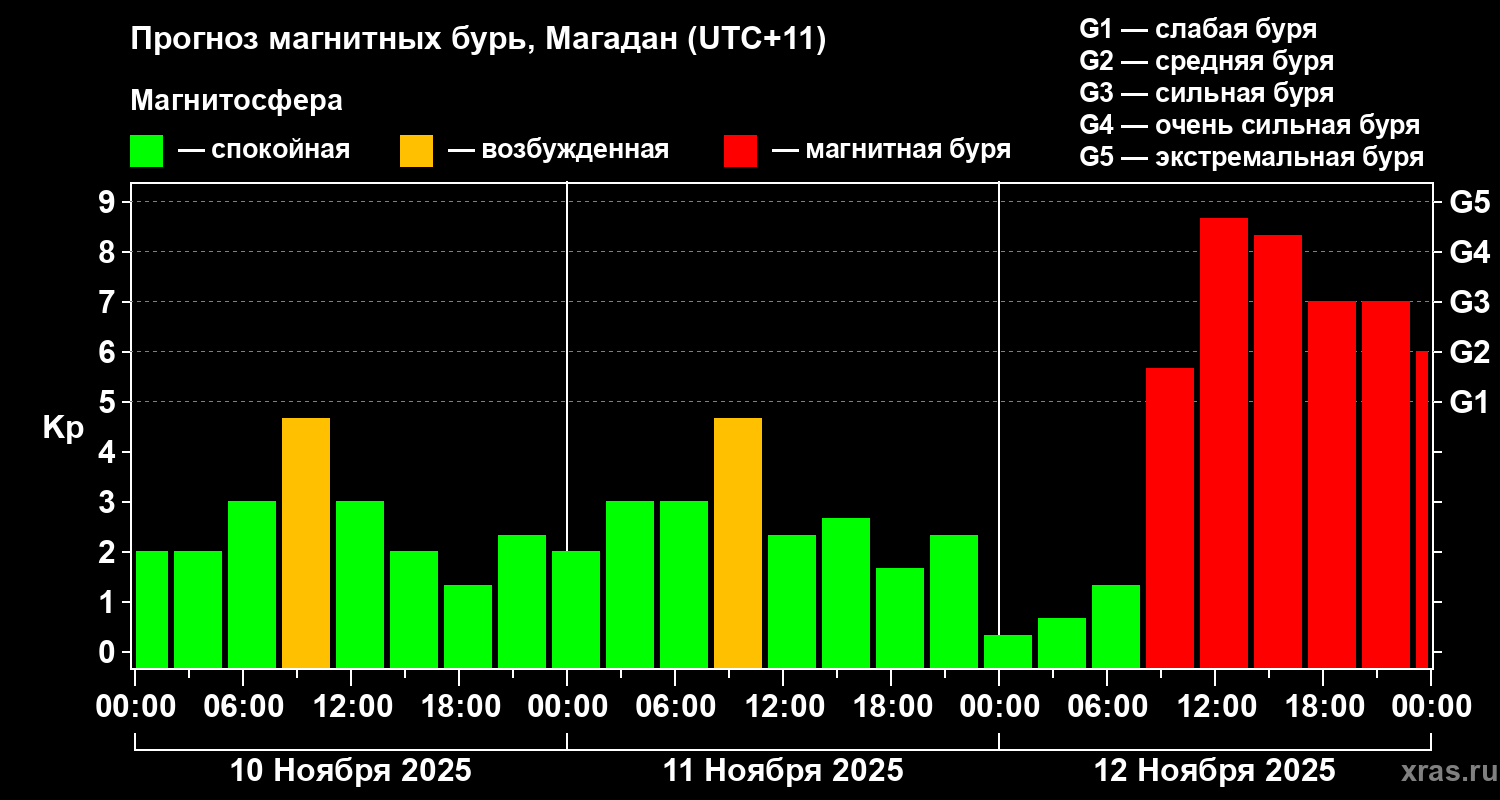 Прогноз магнитных бурь в Магадане — 10 ноября 2025 года