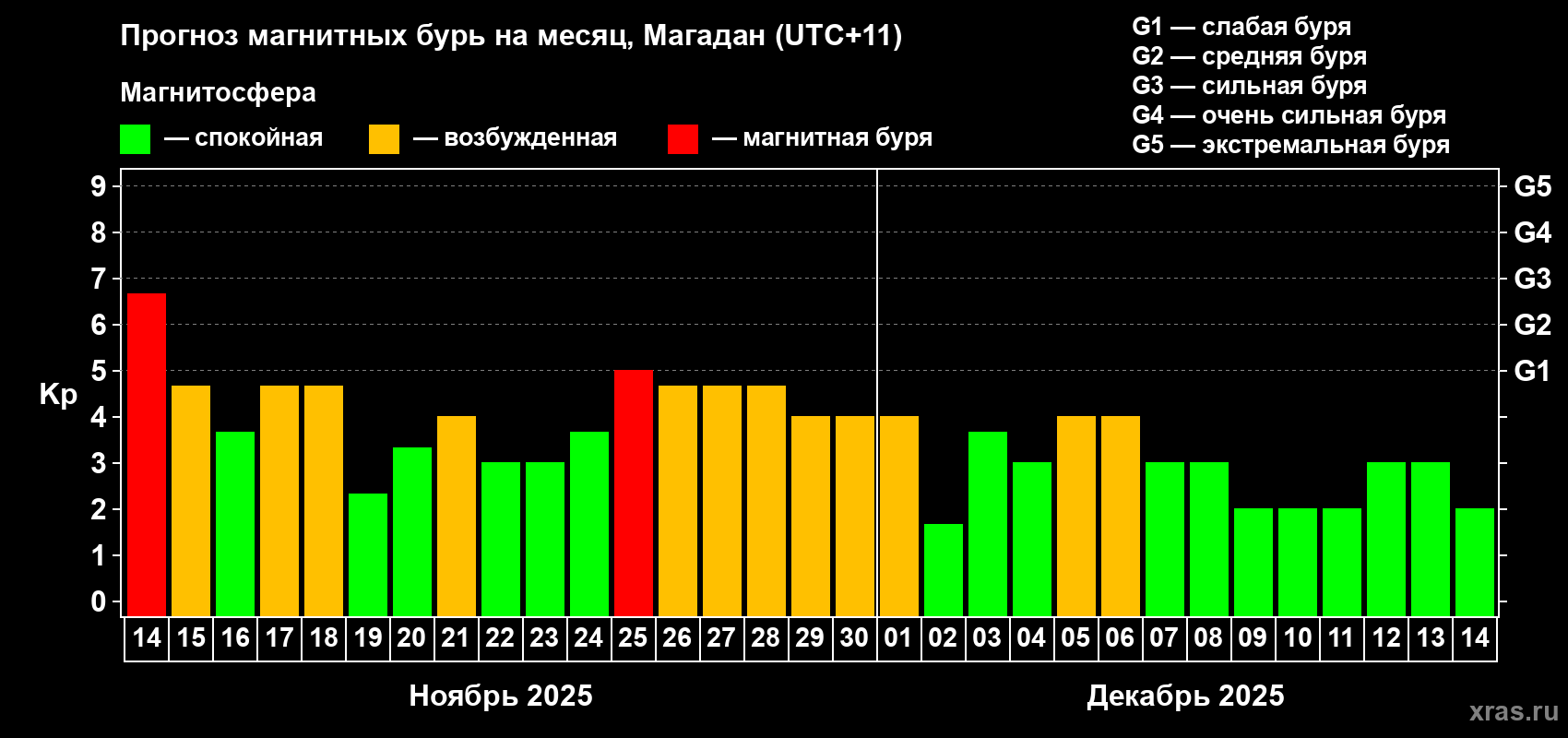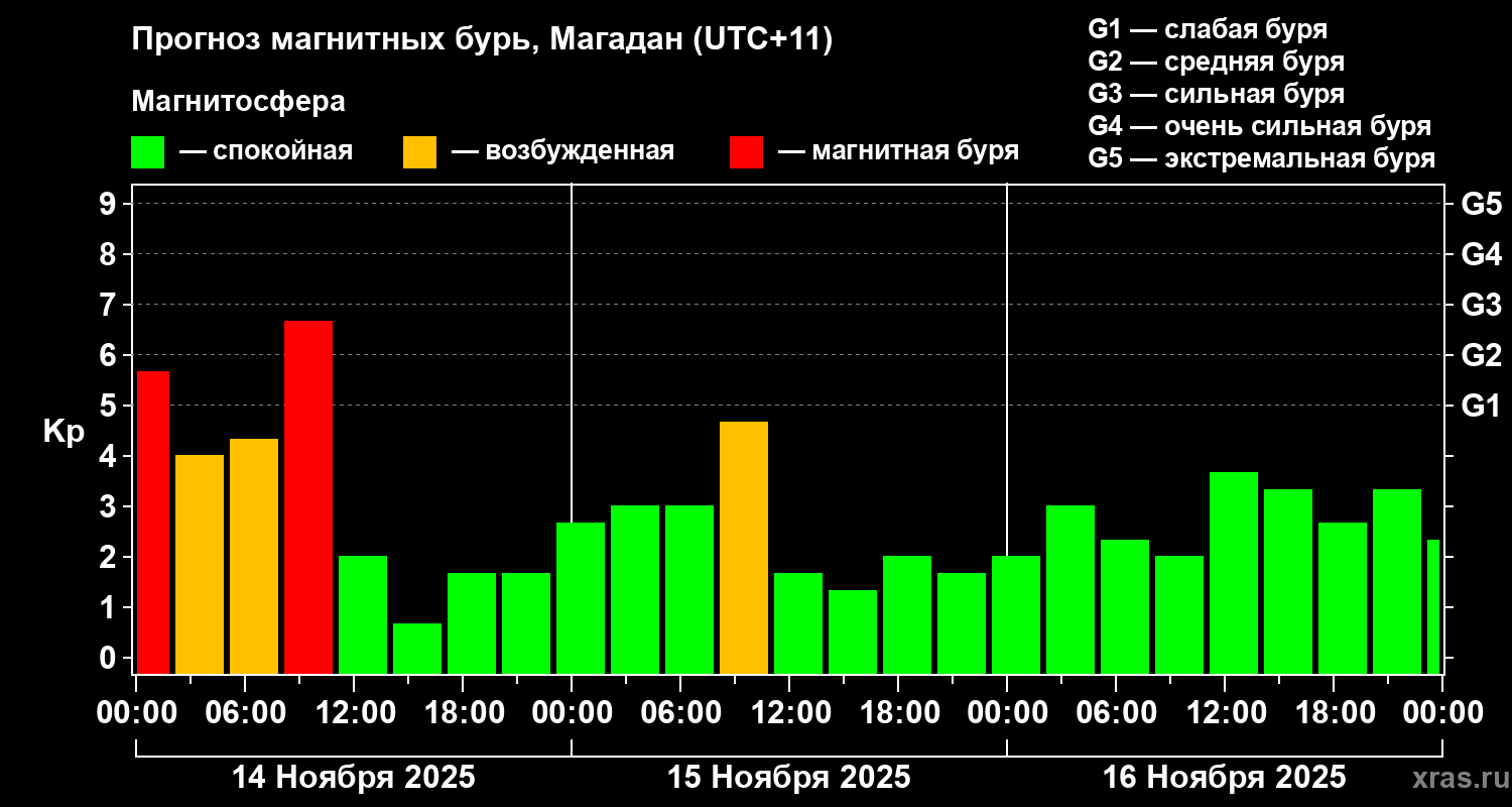 Прогноз магнитных бурь в Магадане — 14 ноября 2025 года