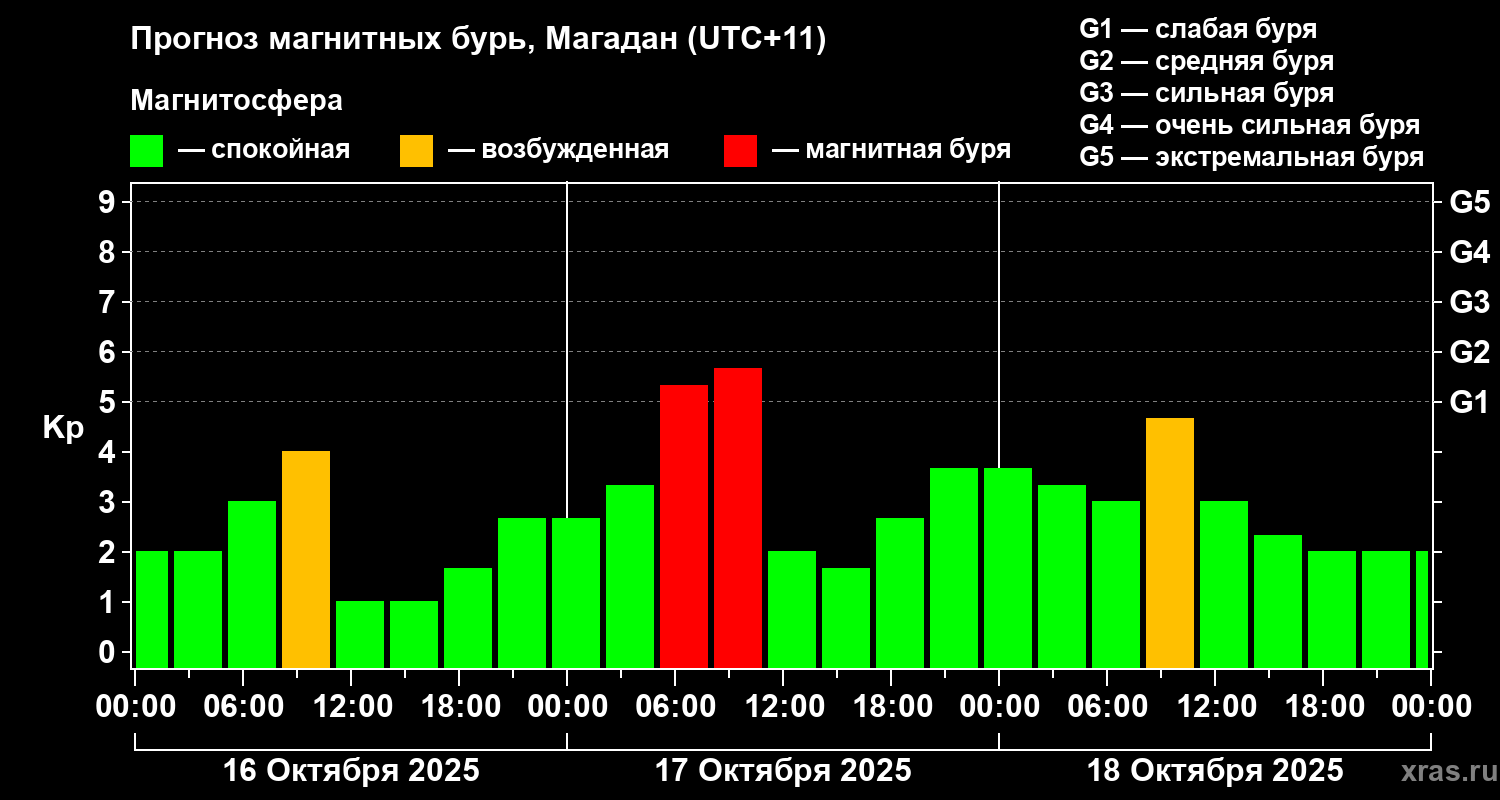 Прогноз магнитных бурь в Магадане — 16 октября 2025 года