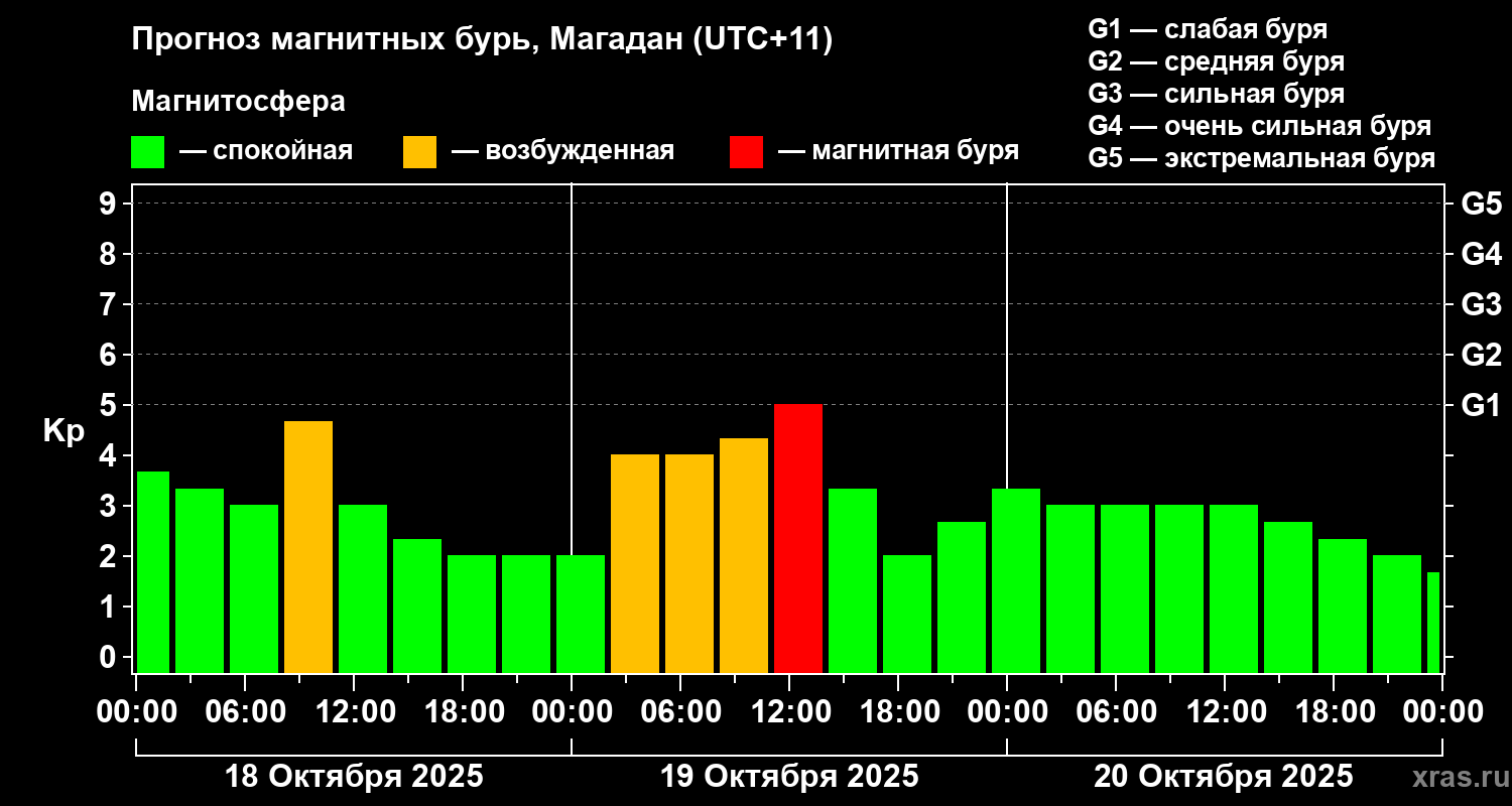 Прогноз магнитных бурь в Магадане — 18 октября 2025 года