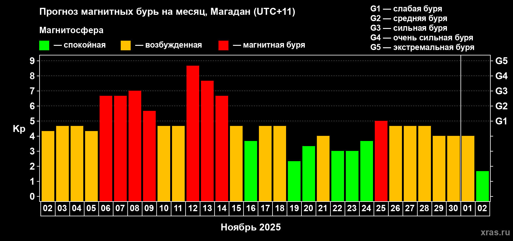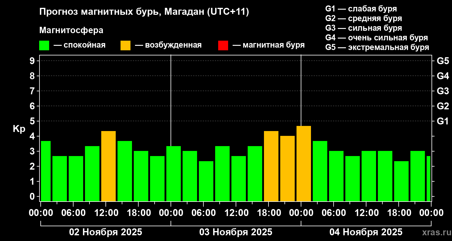 Прогноз магнитных бурь в Магадане — 2 ноября 2025 года