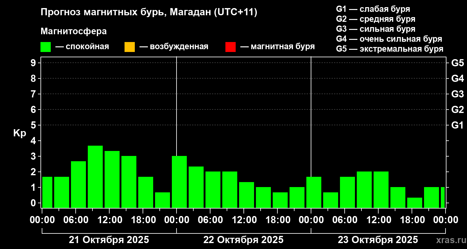 Прогноз магнитных бурь в Магадане — 21 октября 2025 года