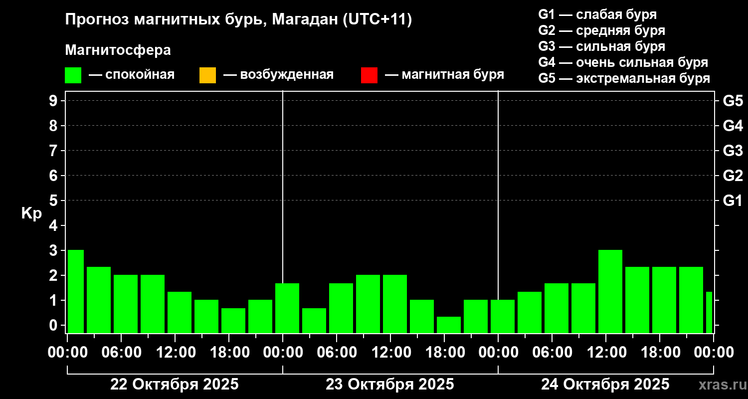 Прогноз магнитных бурь в Магадане — 22 октября 2025 года