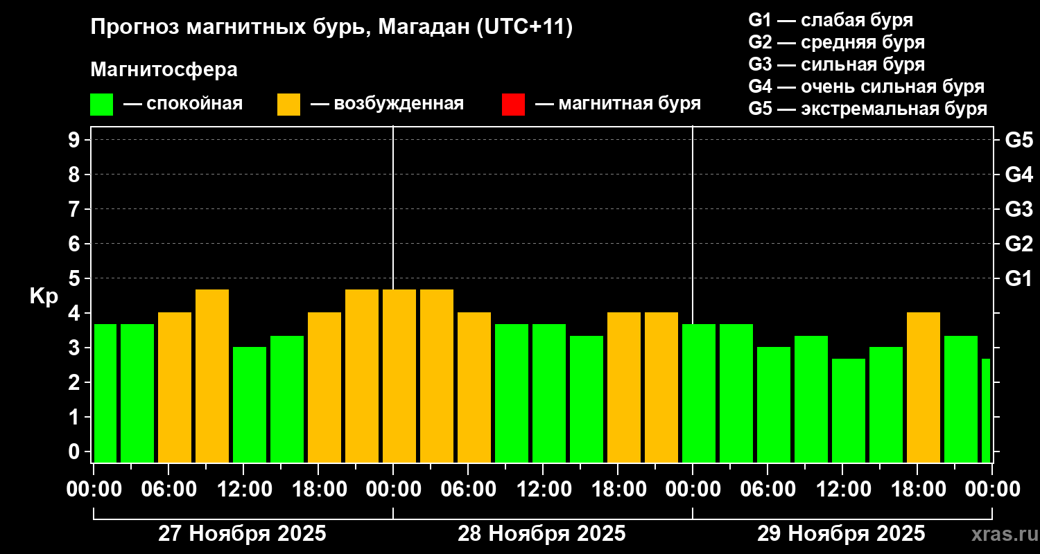 Прогноз магнитных бурь в Магадане — 27 ноября 2025 года