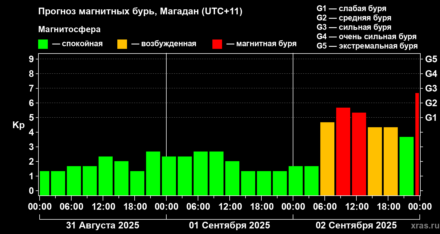 Прогноз магнитных бурь в Магадане — 31 августа 2025 года