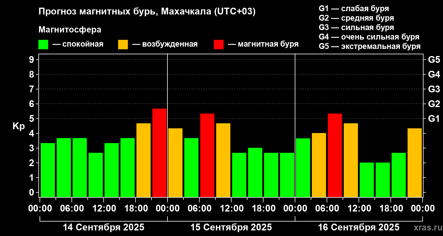 Прогноз магнитных бурь в Махачкале на 14 сентября 2025 года