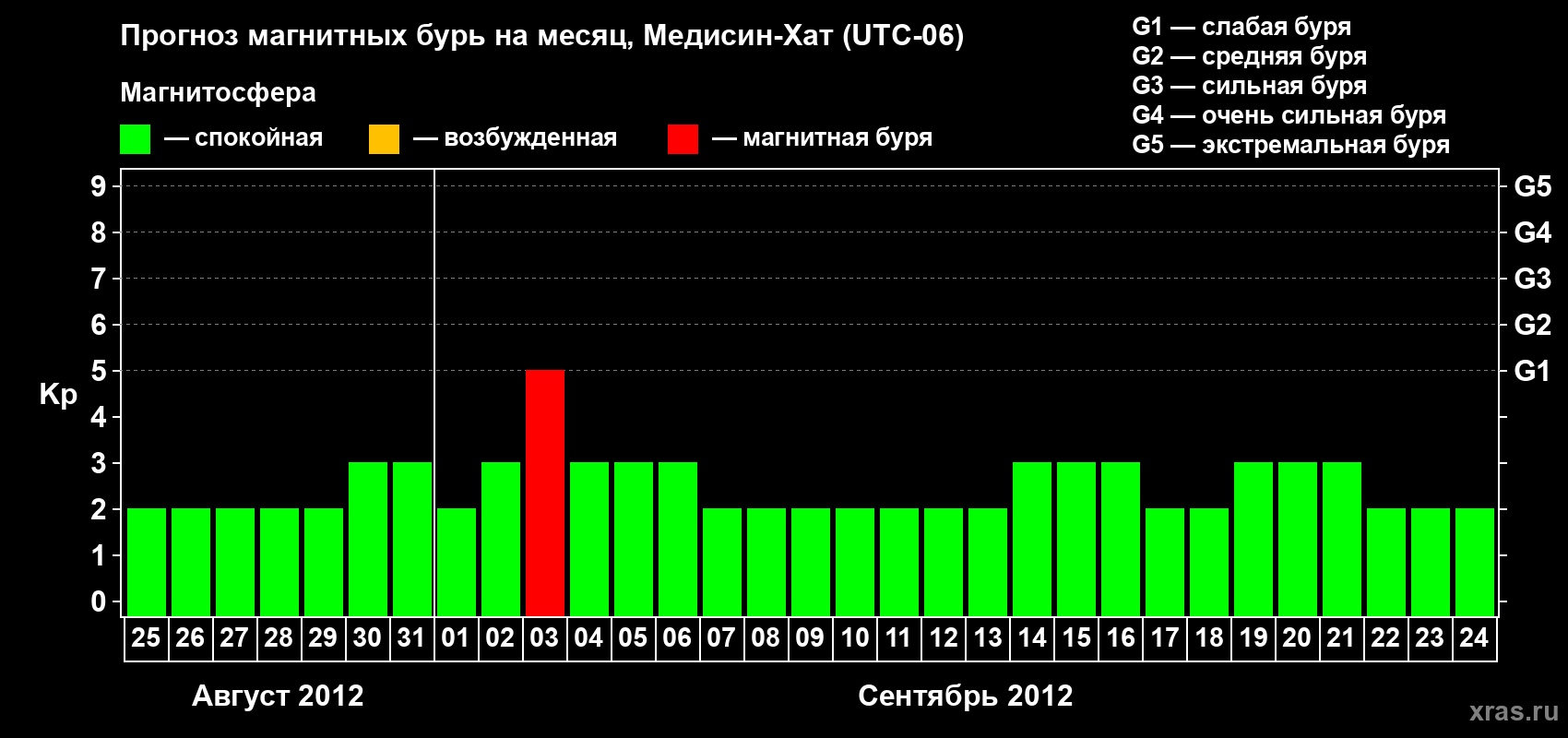 Прогноз магнитных бурь в Медисин-Хате — 25 августа 2012 года