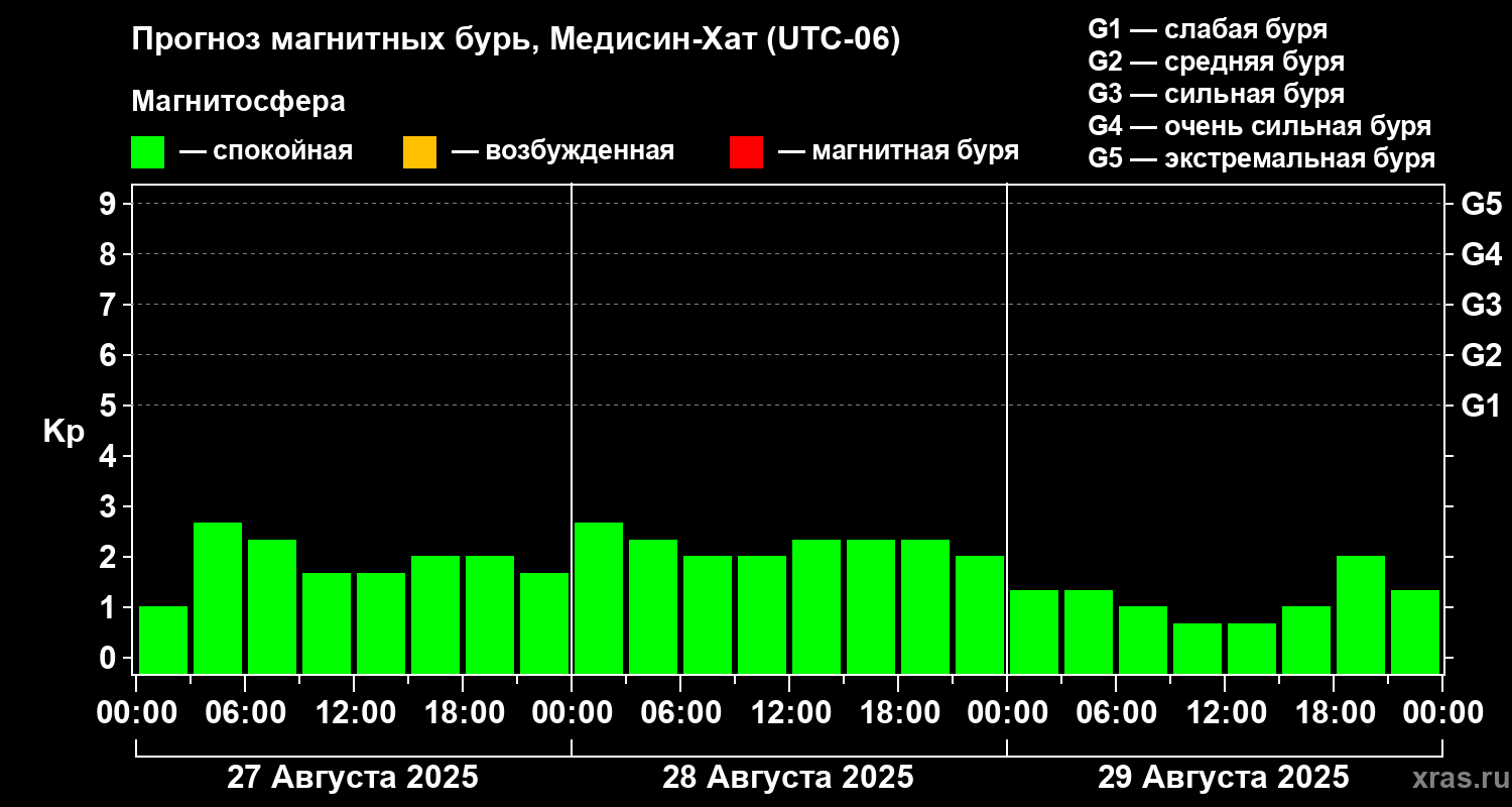 Прогноз магнитных бурь в Медисин-Хате на 27 августа 2025 года