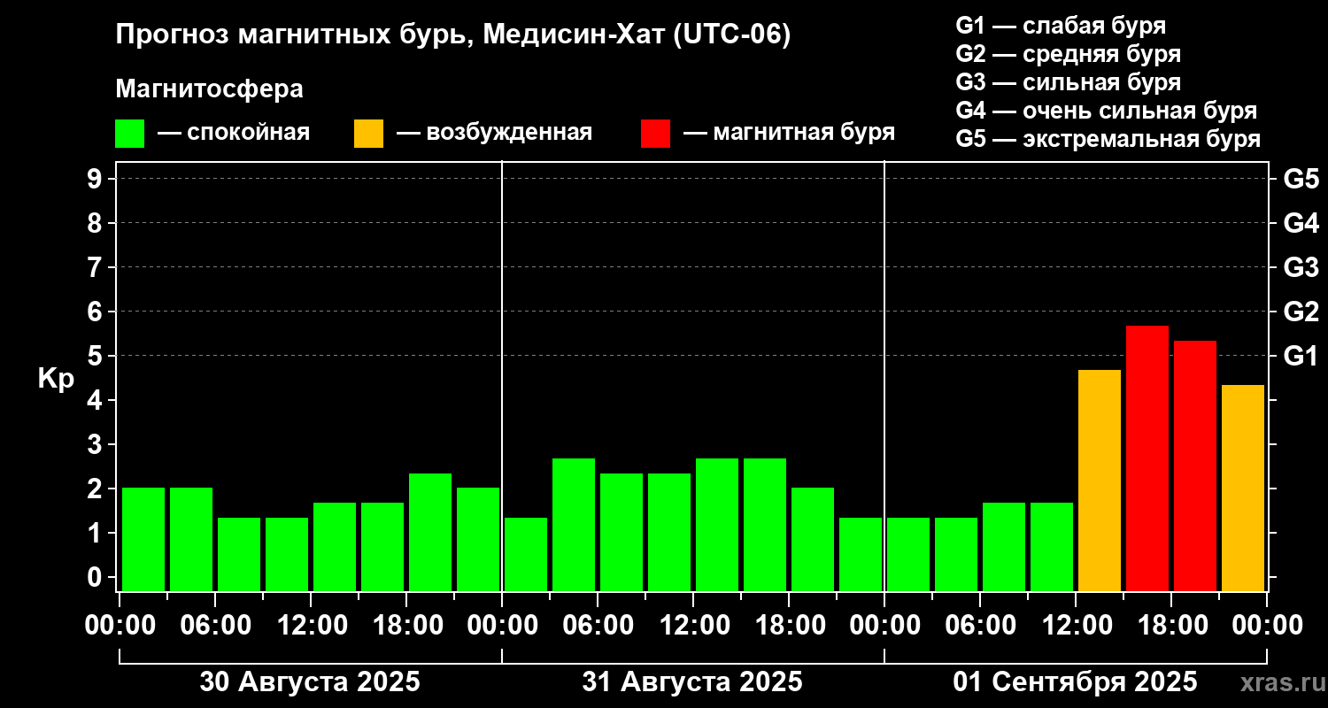 Прогноз магнитных бурь в Медисин-Хате — 30 августа 2025 года