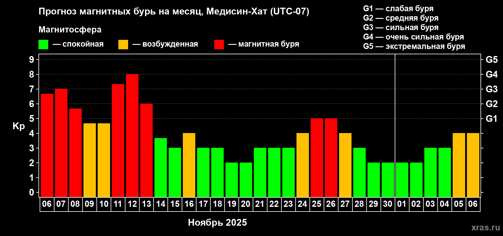 Прогноз магнитных бурь в Медисин-Хате — 6 ноября 2025 года