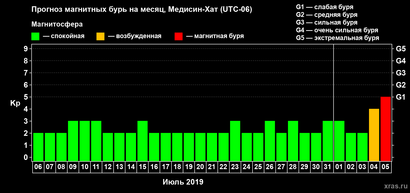 Прогноз магнитных бурь в Медисин-Хате — 6 июля 2019 года