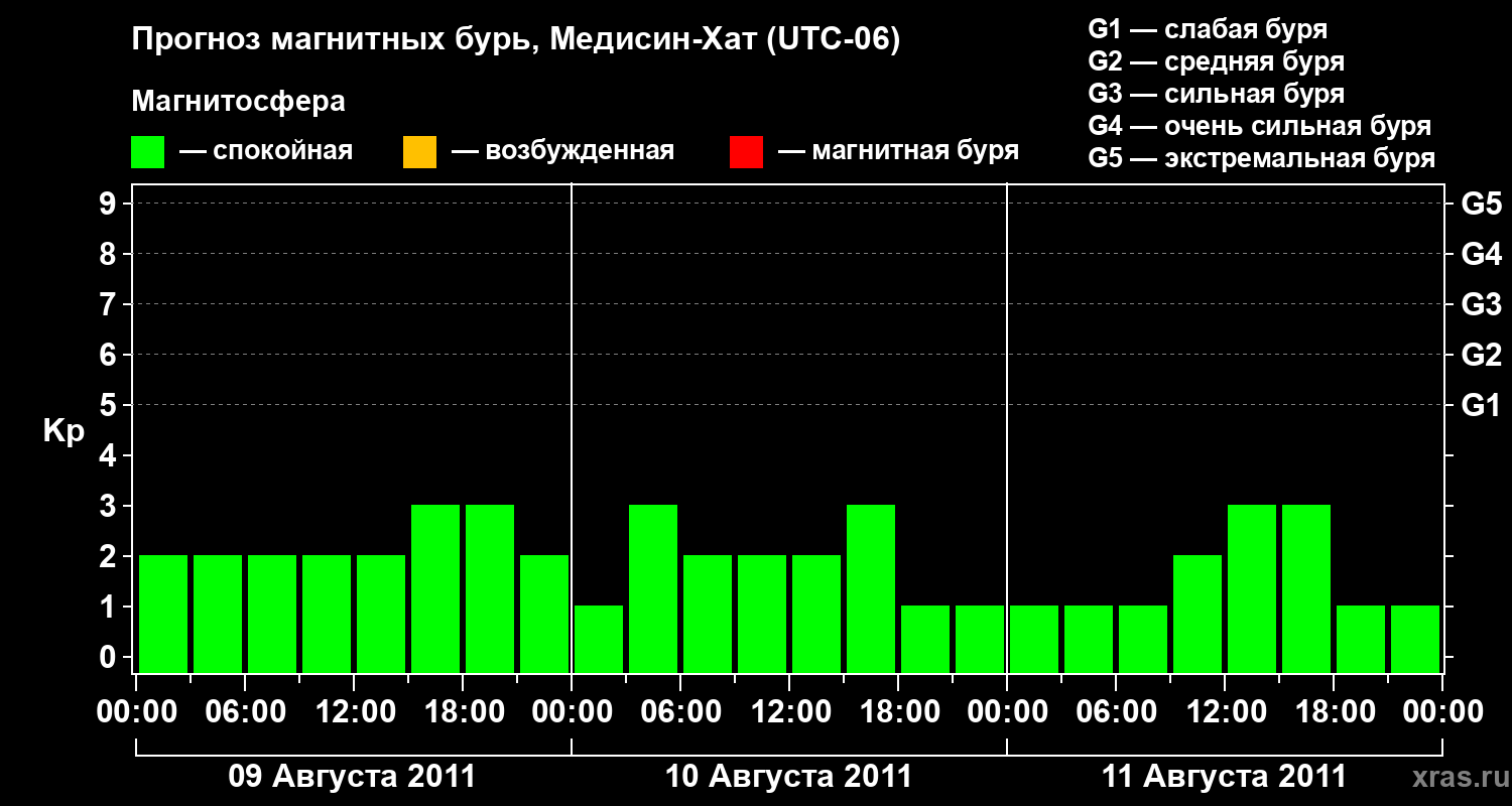 Прогноз магнитных бурь в Медисин-Хате — 9 августа 2011 года